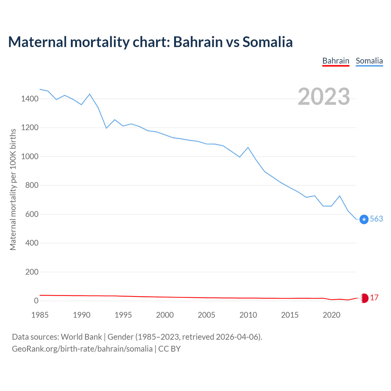 The maternal mortality rate, which is the probability of dying during childbirth or within 42 days of pregnancy termination, is 17 deaths per 100,000 live births in Bahrain, compared to 563 deaths in Somalia.