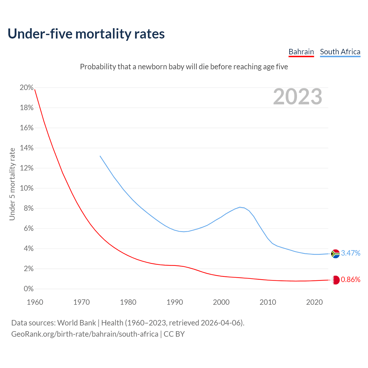 The chance that a newborn baby will die before reaching age five is 0.86% in Bahrain and 3.47% in South Africa. Above is a chart with historical data on under-five mortality rates.