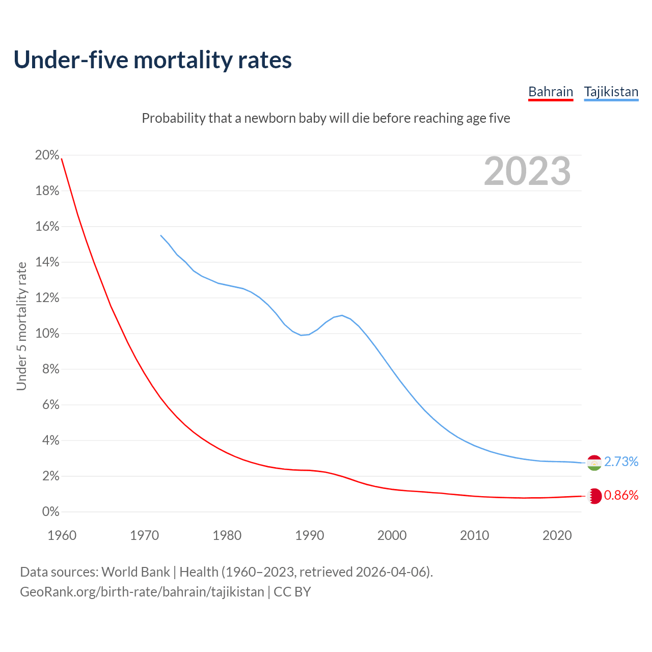 The chance that a newborn baby will die before reaching age five is 0.86% in Bahrain and 2.73% in Tajikistan. Above is a chart with historical data on under-five mortality rates.