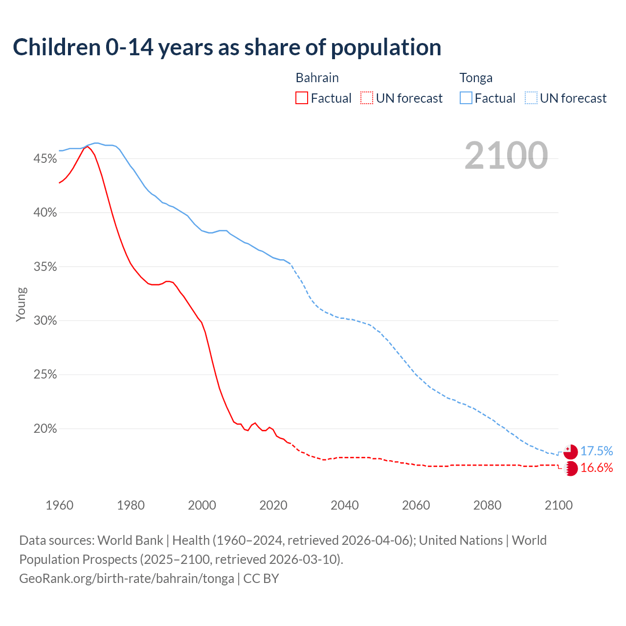 Bahrain has an annual birth rate of 12.5 births per 1,000 people, compared to 23.1 for Tonga. The average number of children a woman is expected to have during her lifetime — the fertility rate, is 1.82 in Bahrain and 3.13 in Tonga — 71.5% difference.