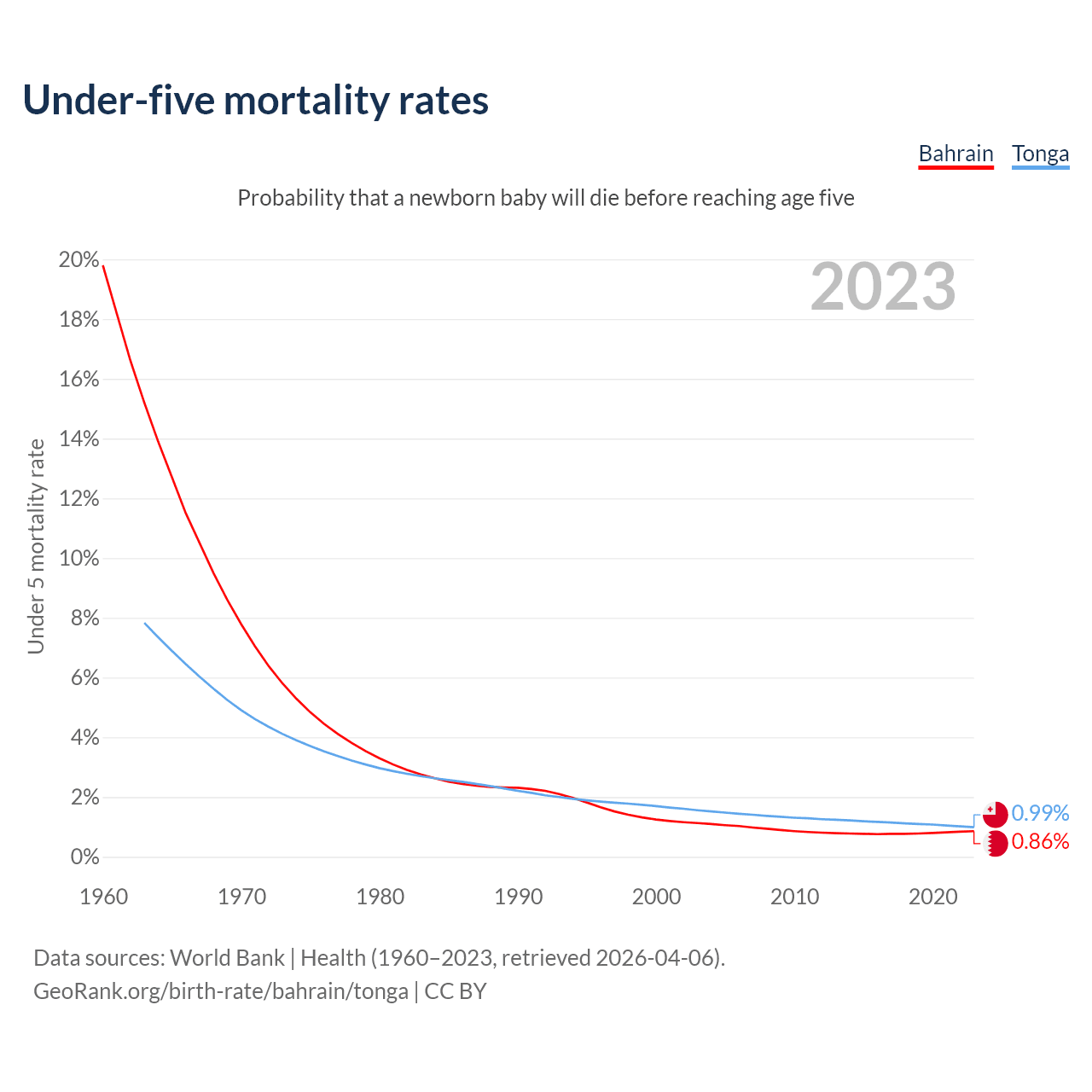 The chance that a newborn baby will die before reaching age five is 0.86% in Bahrain and 0.99% in Tonga. Above is a chart with historical data on under-five mortality rates.