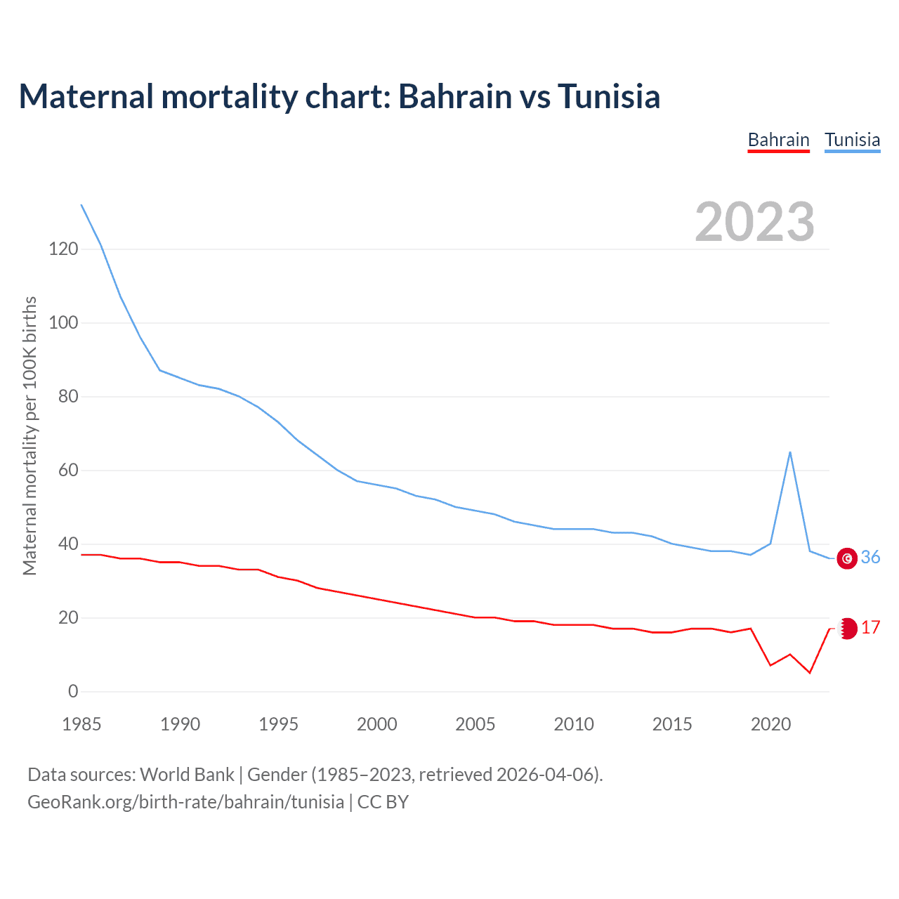 The maternal mortality rate, which is the probability of dying during childbirth or within 42 days of pregnancy termination, is 17 deaths per 100,000 live births in Bahrain, compared to 36 deaths in Tunisia.