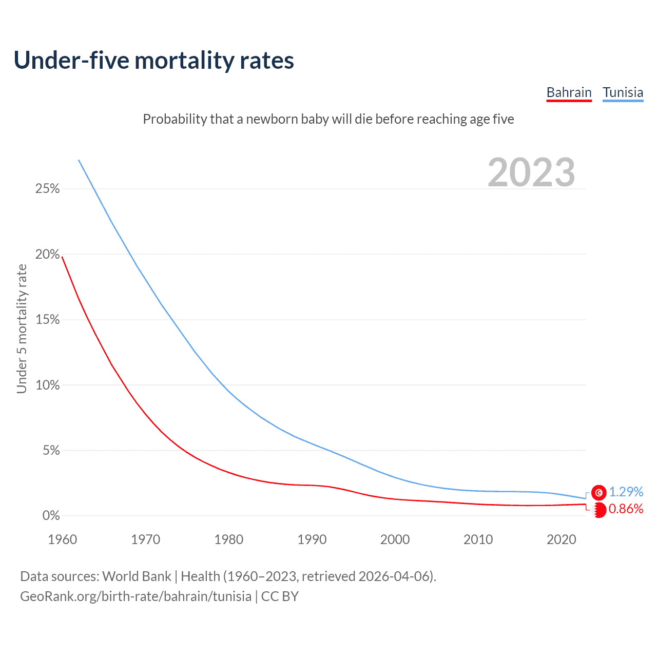 The chance that a newborn baby will die before reaching age five is 0.86% in Bahrain and 1.29% in Tunisia. Above is a chart with historical data on under-five mortality rates.