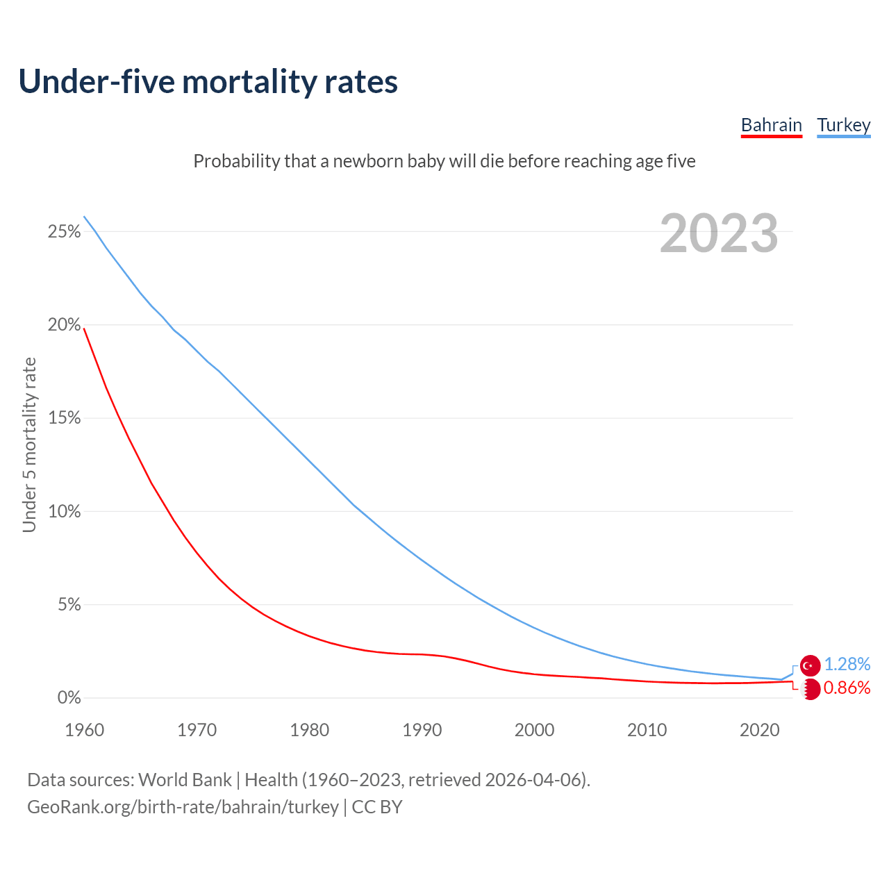 The chance that a newborn baby will die before reaching age five is 0.86% in Bahrain and 1.28% in Turkey. Above is a chart with historical data on under-five mortality rates.