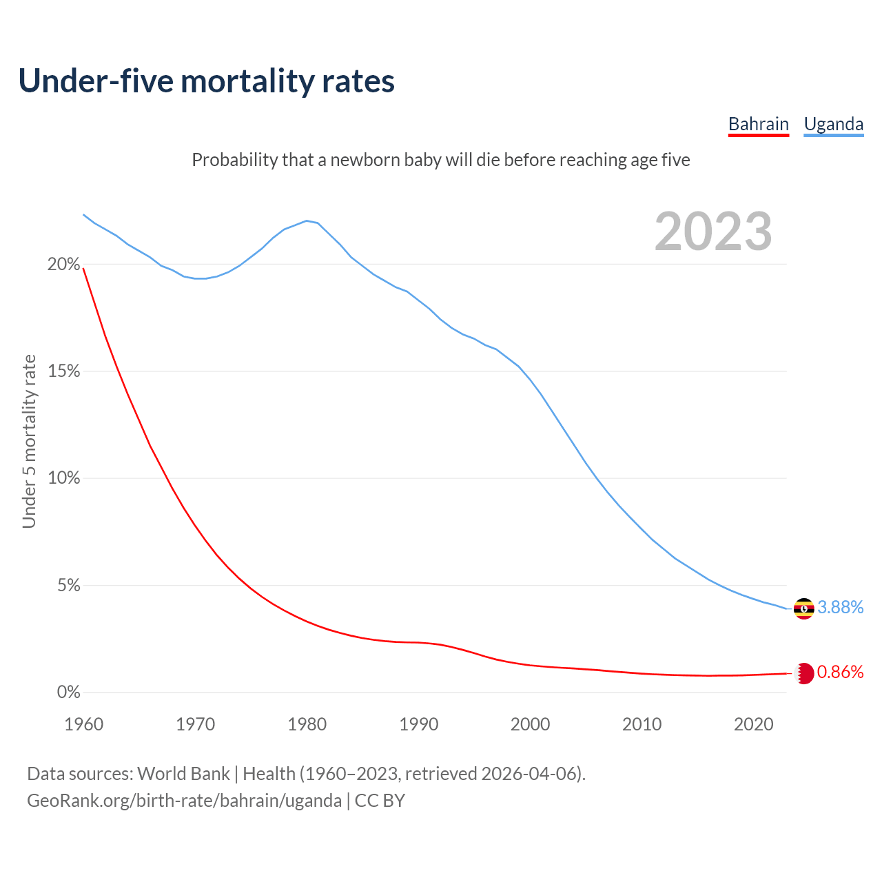 The chance that a newborn baby will die before reaching age five is 0.86% in Bahrain and 3.88% in Uganda. Above is a chart with historical data on under-five mortality rates.