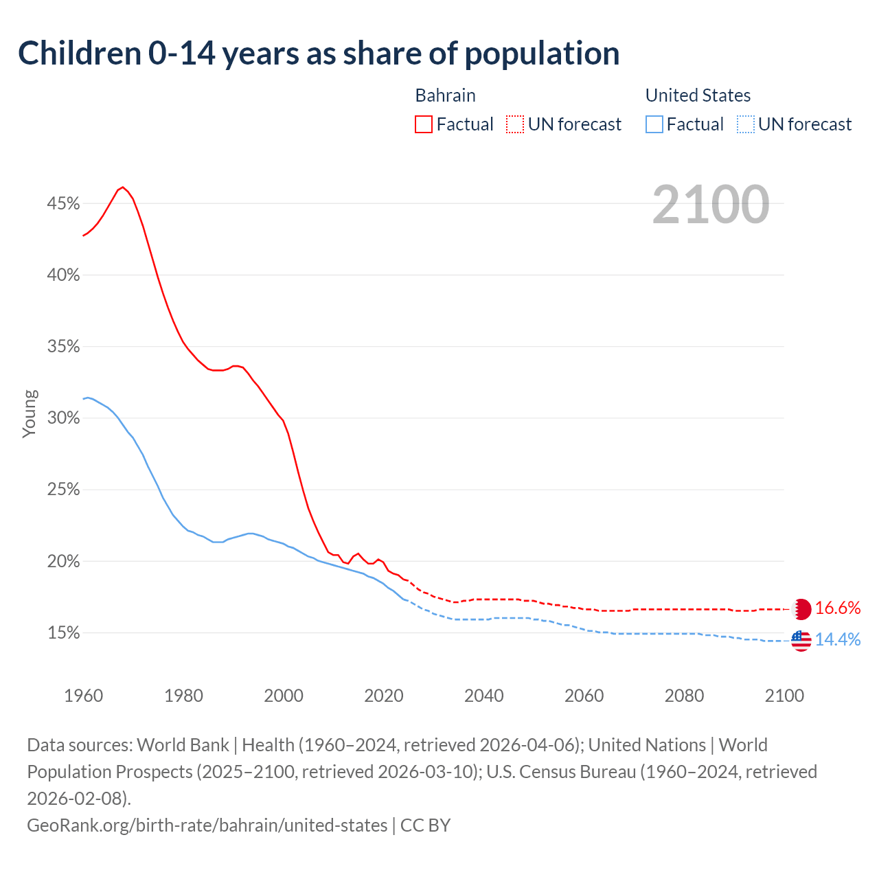 According to the latest available data on birth rates, the fertility rate in Bahrain was 1.82 children per woman in 2023, compared to 1.62 in the United States in 2023. The replacement level is considered to be 2.1 children per woman.