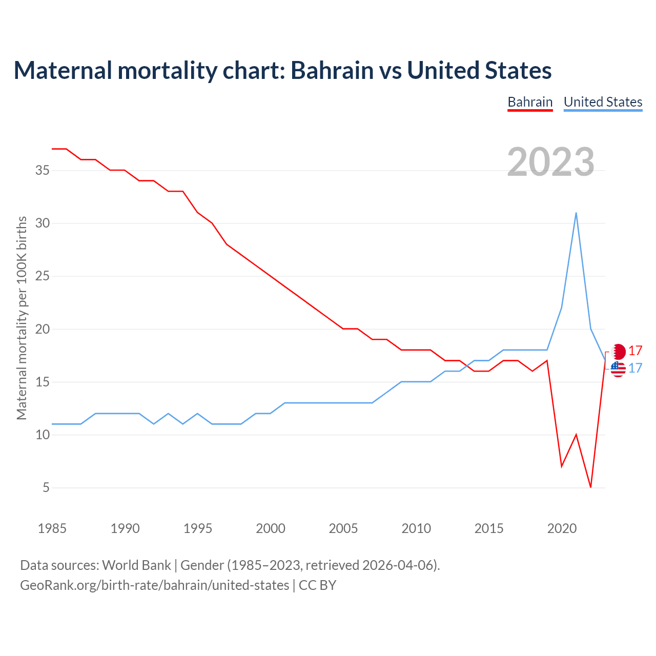 The maternal mortality rate, which is the probability of dying during childbirth or within 42 days of pregnancy termination, is 17 deaths per 100,000 live births in Bahrain, compared to 17 deaths in the United States.