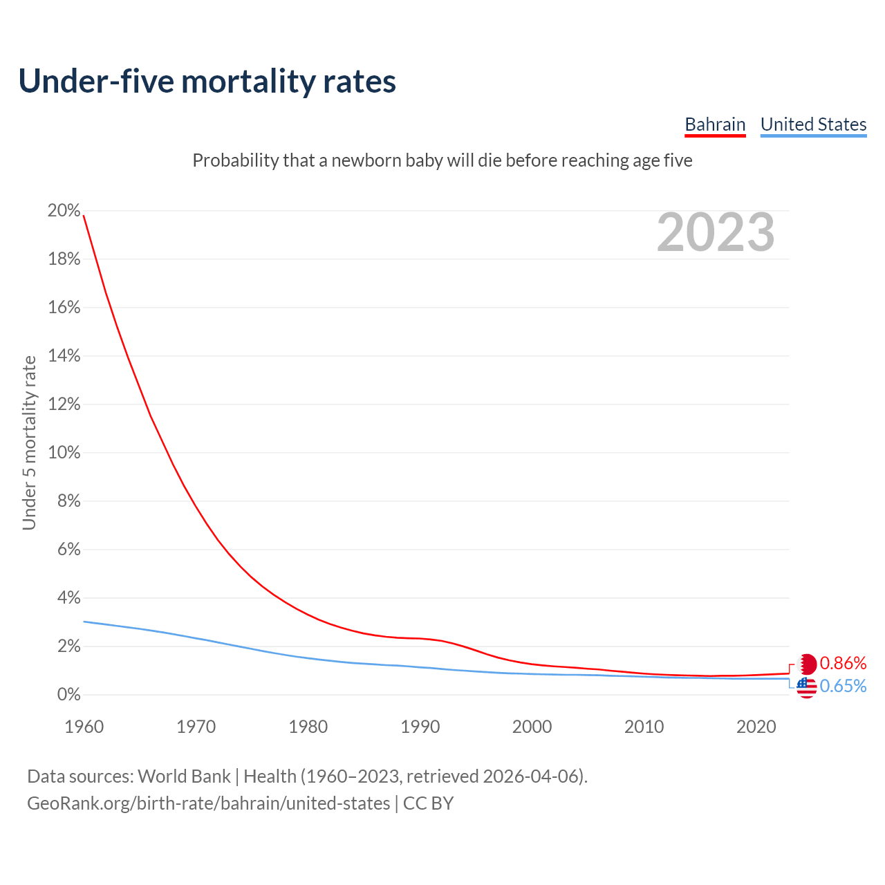 The chance that a newborn baby will die before reaching age five is 0.86% in Bahrain and 0.65% in the United States. Above is a chart with historical data on under-five mortality rates.
