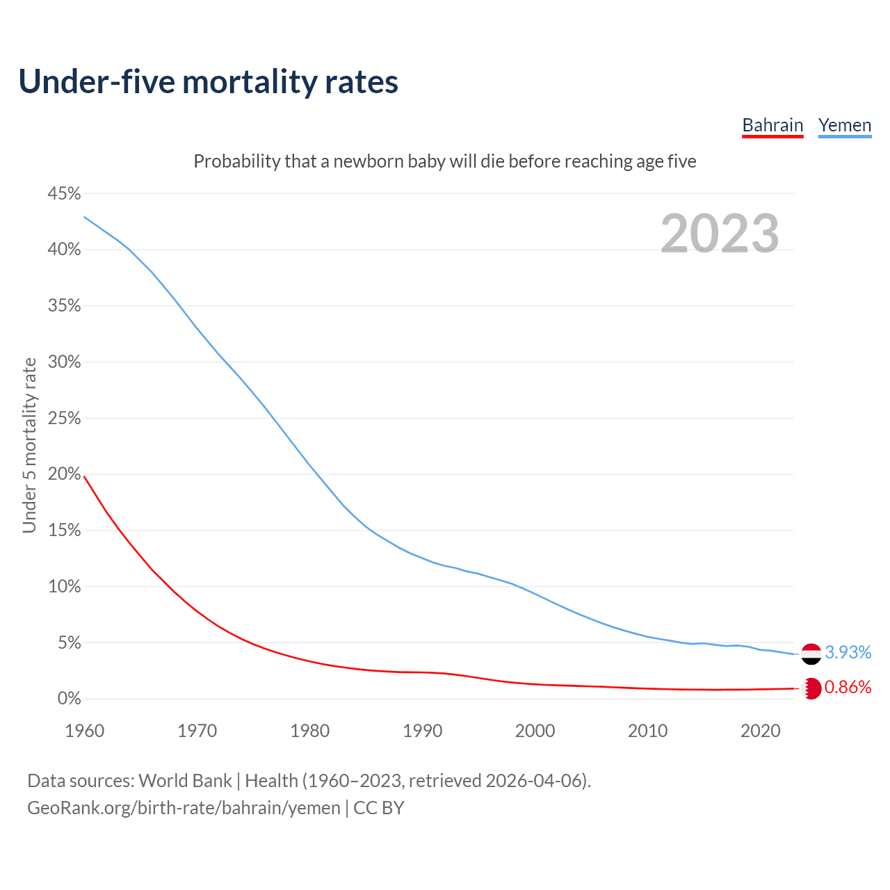 The chance that a newborn baby will die before reaching age five is 0.86% in Bahrain and 3.93% in Yemen. Above is a chart with historical data on under-five mortality rates.