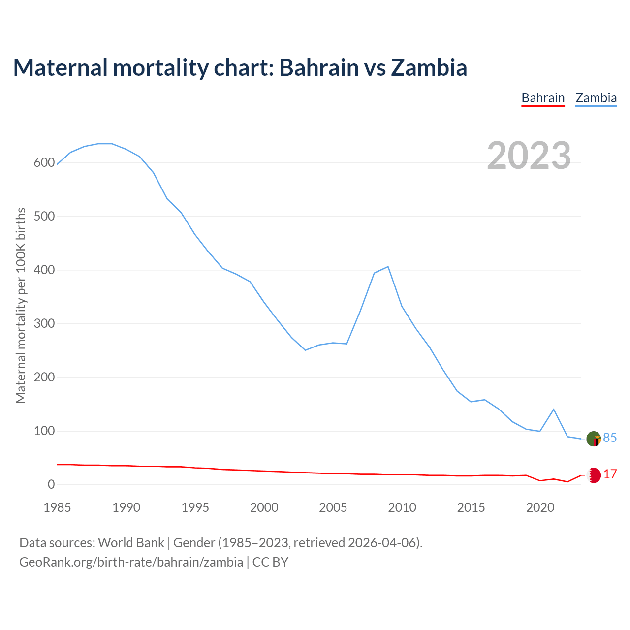 The maternal mortality rate, which is the probability of dying during childbirth or within 42 days of pregnancy termination, is 17 deaths per 100,000 live births in Bahrain, compared to 85 deaths in Zambia.