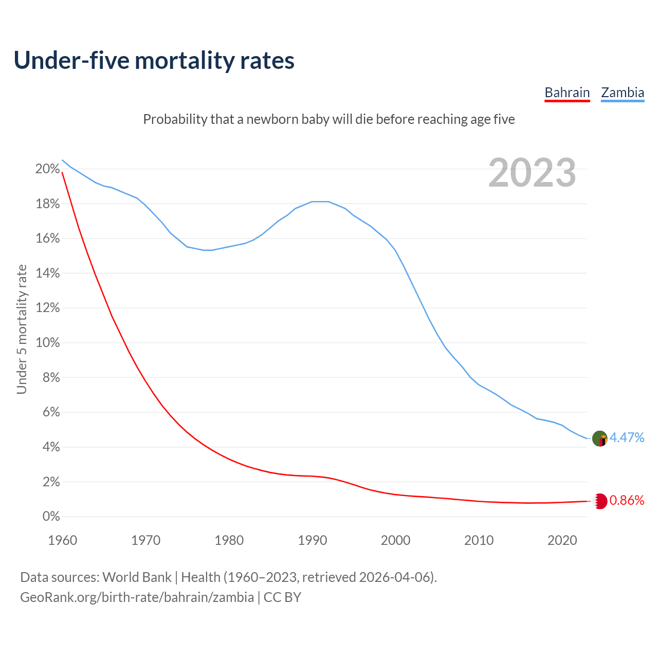 The chance that a newborn baby will die before reaching age five is 0.86% in Bahrain and 4.47% in Zambia. Above is a chart with historical data on under-five mortality rates.
