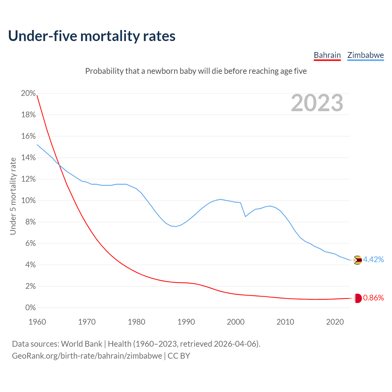 The chance that a newborn baby will die before reaching age five is 0.86% in Bahrain and 4.42% in Zimbabwe. Above is a chart with historical data on under-five mortality rates.
