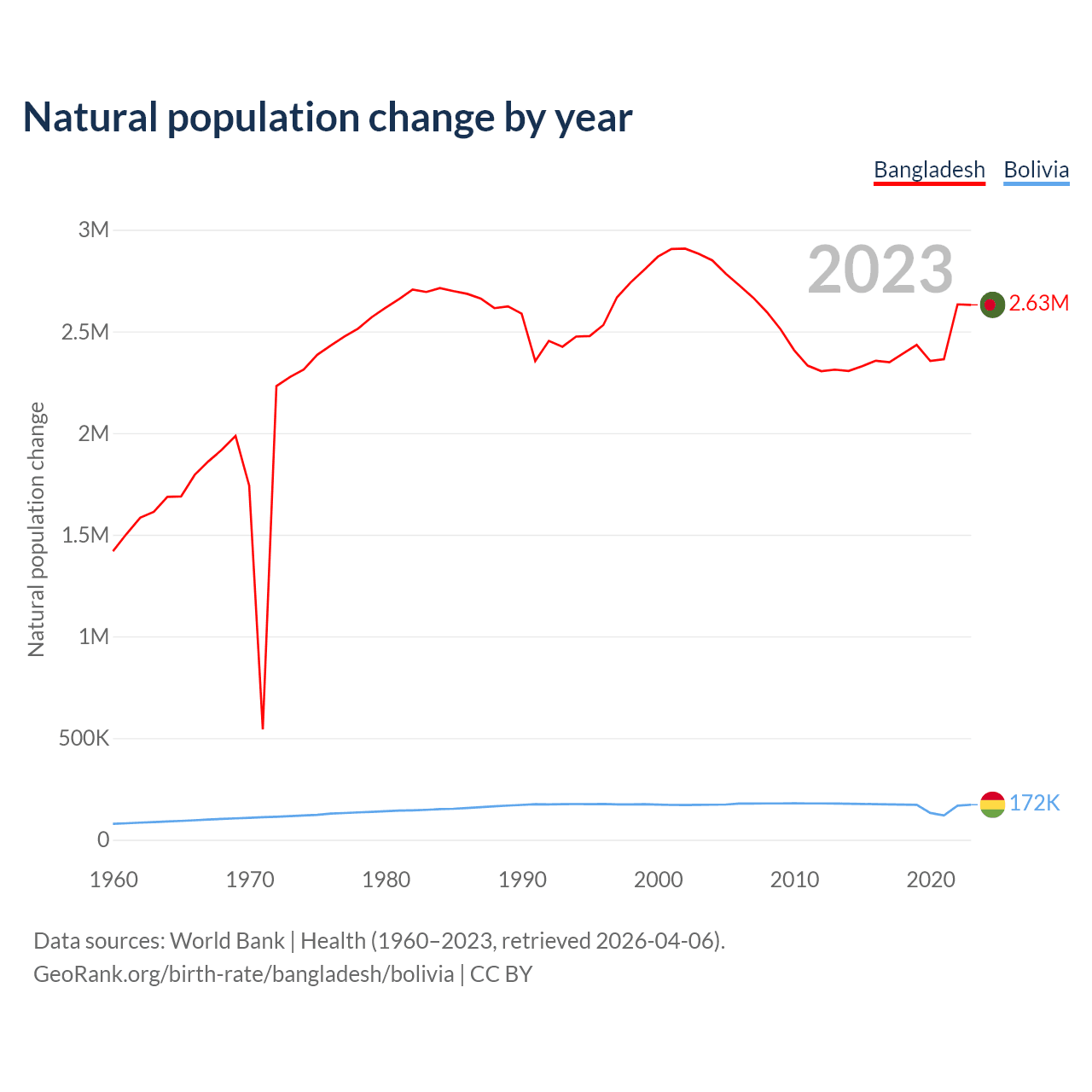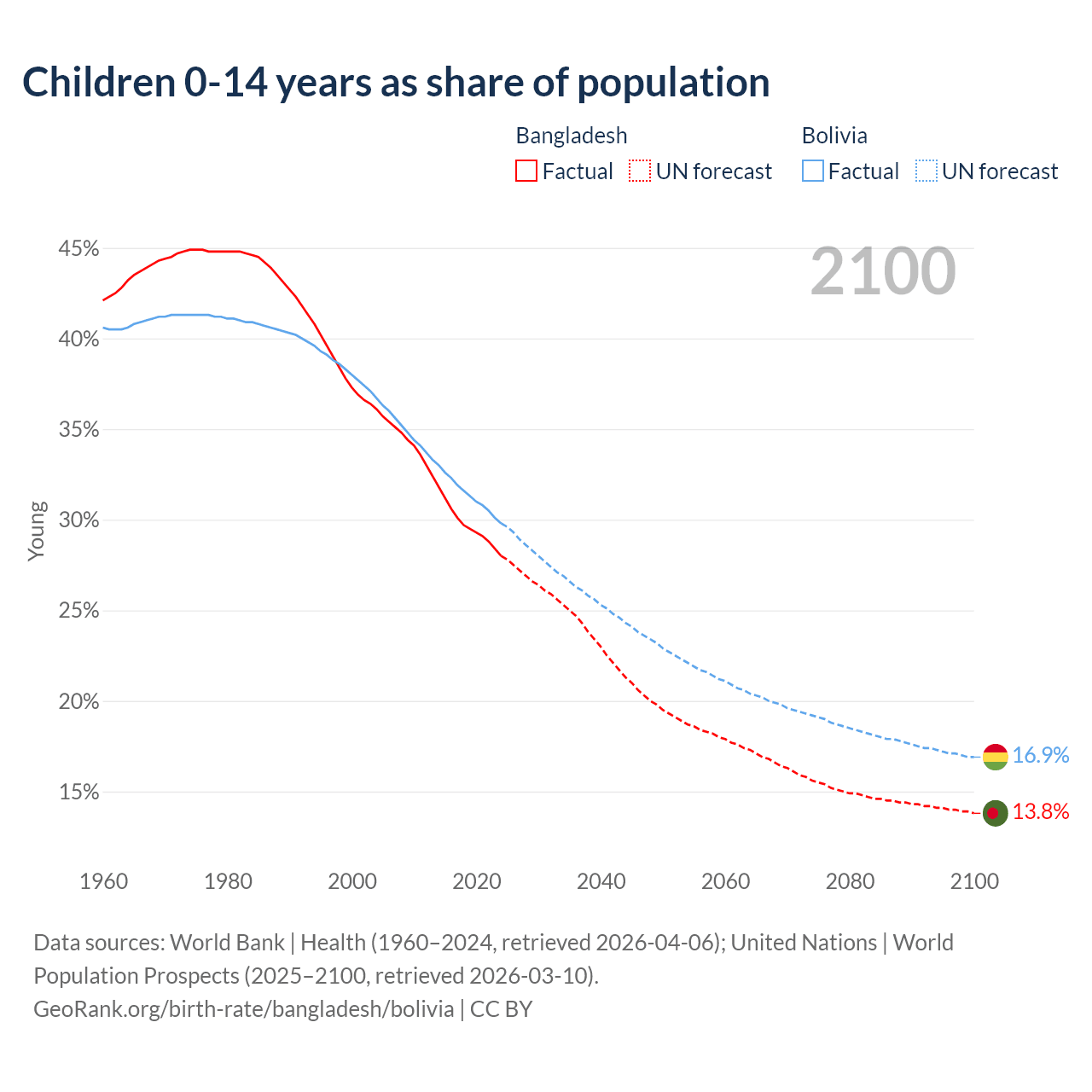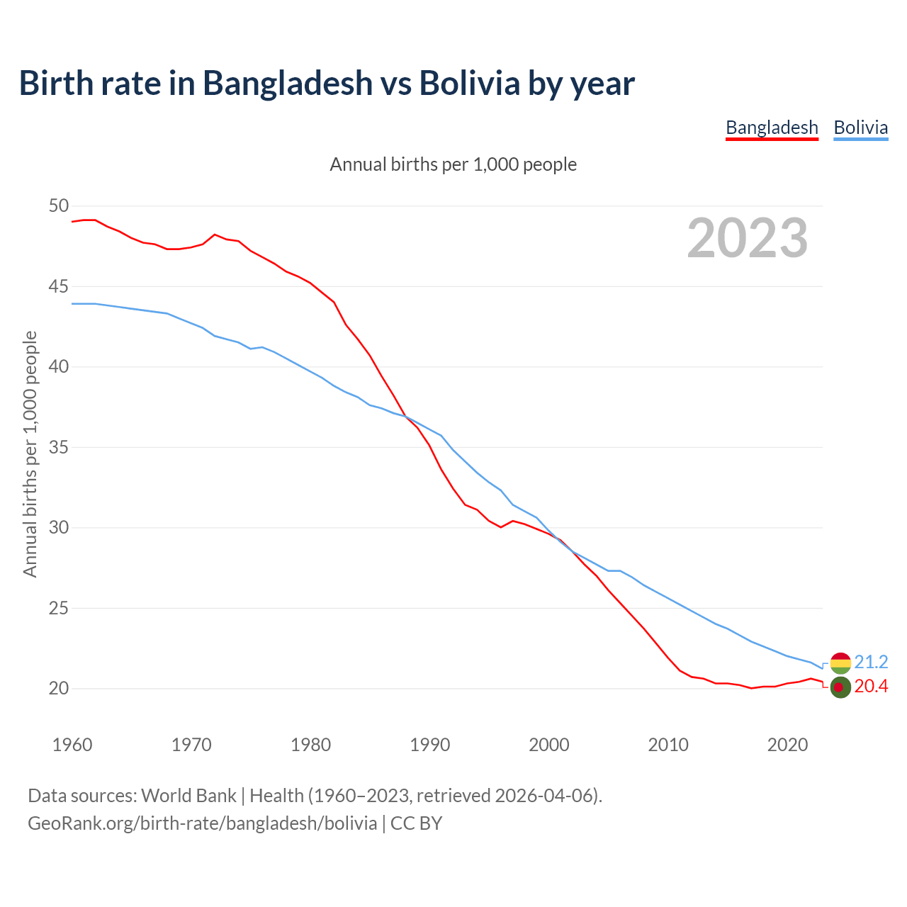 According to the latest available data on birth rates, the fertility rate in Bangladesh was 2.16 children per woman in 2023, compared to 2.55 in Bolivia in 2023. The replacement level is considered to be 2.1 children per woman.