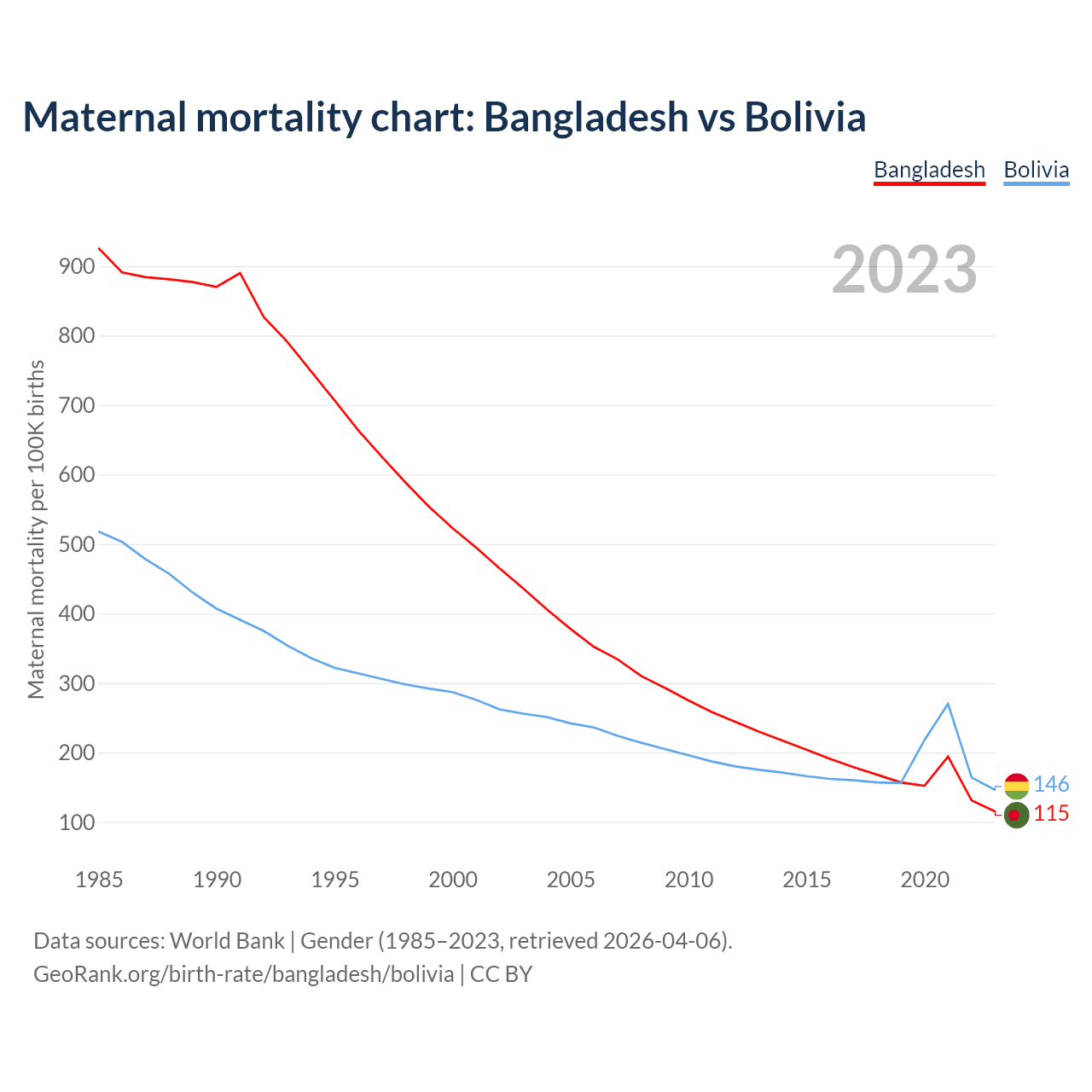 The maternal mortality rate, which is the probability of dying during childbirth or within 42 days of pregnancy termination, is 115 deaths per 100,000 live births in Bangladesh, compared to 146 deaths in Bolivia.