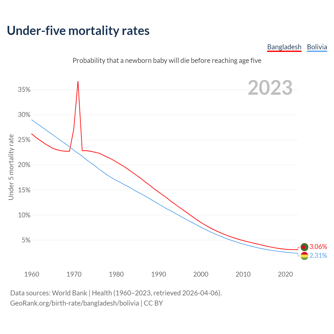 The chance that a newborn baby will die before reaching age five is 3.06% in Bangladesh and 2.31% in Bolivia. Above is a chart with historical data on under-five mortality rates.