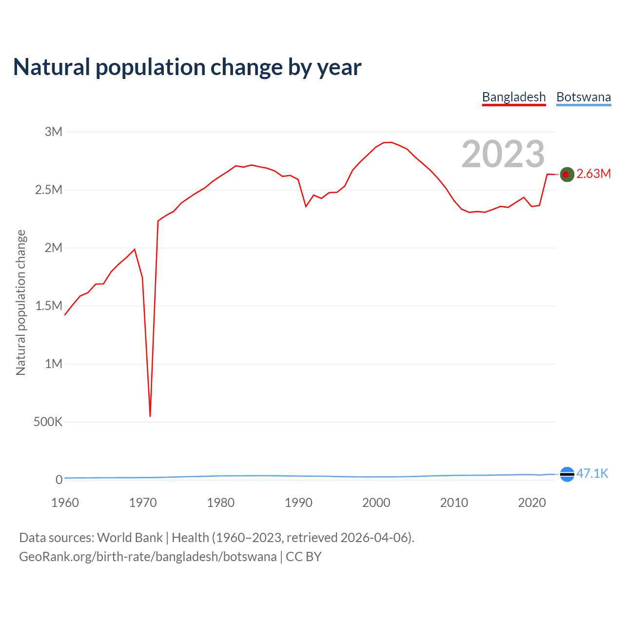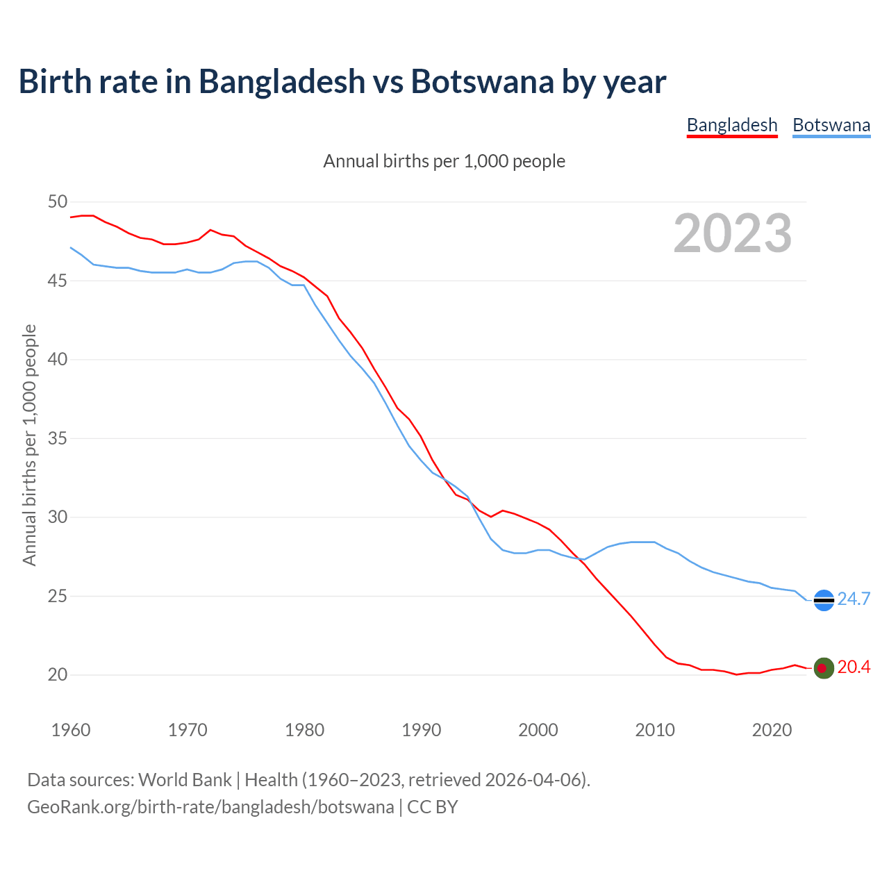 Bangladesh has an annual birth rate of 20.4 births per 1,000 people, compared to 24.7 for Botswana. The average number of children a woman is expected to have during her lifetime — the fertility rate, is 2.16 in Bangladesh and 2.73 in Botswana — 26.3% difference.