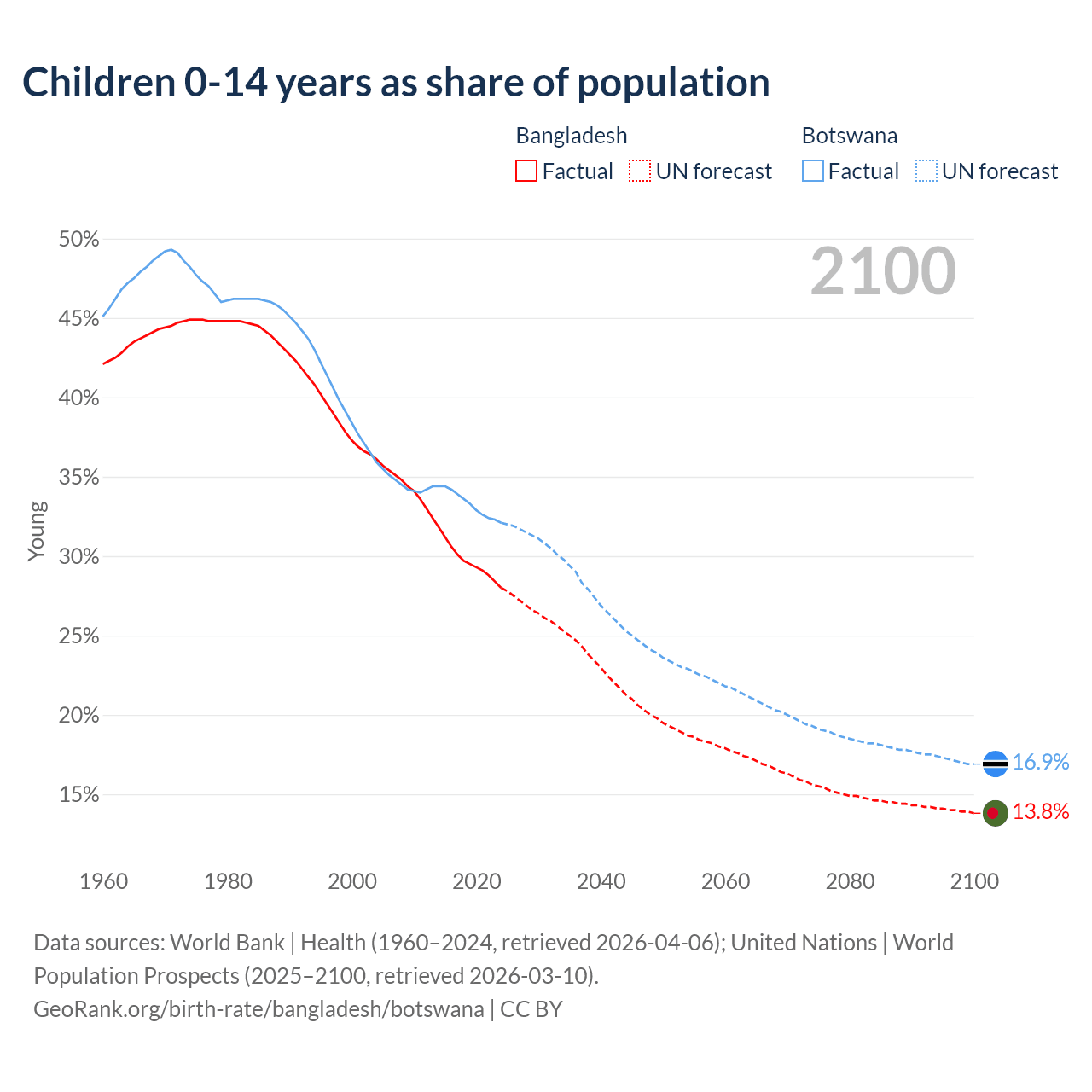 According to the latest available data on birth rates, the fertility rate in Bangladesh was 2.16 children per woman in 2023, compared to 2.73 in Botswana in 2023. The replacement level is considered to be 2.1 children per woman.