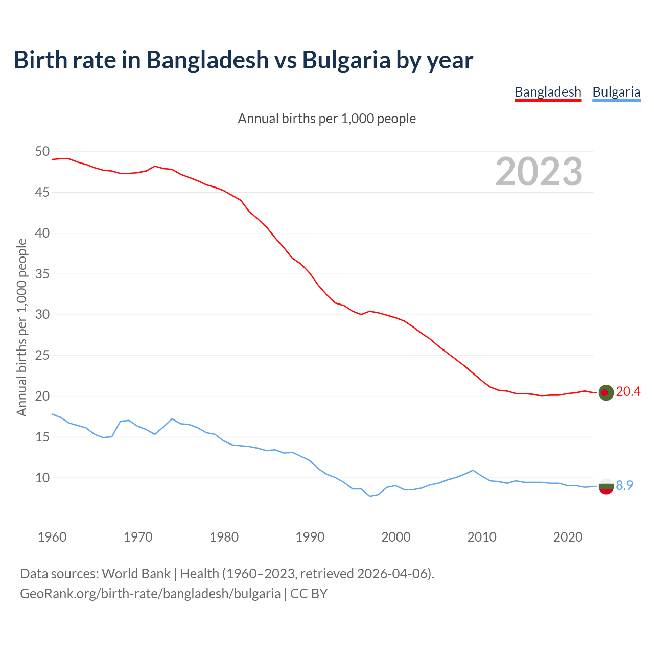 Bangladesh has an annual birth rate of 20.4 births per 1,000 people, compared to 8.9 for Bulgaria. The average number of children a woman is expected to have during her lifetime — the fertility rate, is 2.16 in Bangladesh and 1.81 in Bulgaria — 16.3% difference.