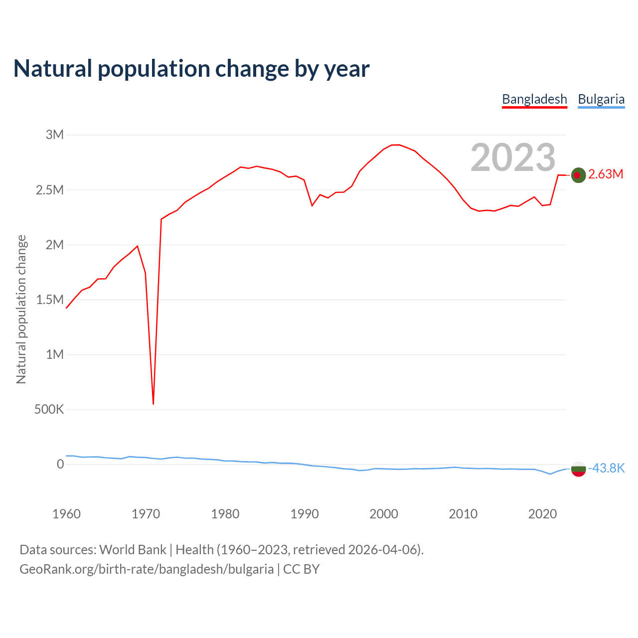 According to the latest available data on birth rates, the fertility rate in Bangladesh was 2.16 children per woman in 2023, compared to 1.81 in Bulgaria in 2023. The replacement level is considered to be 2.1 children per woman.