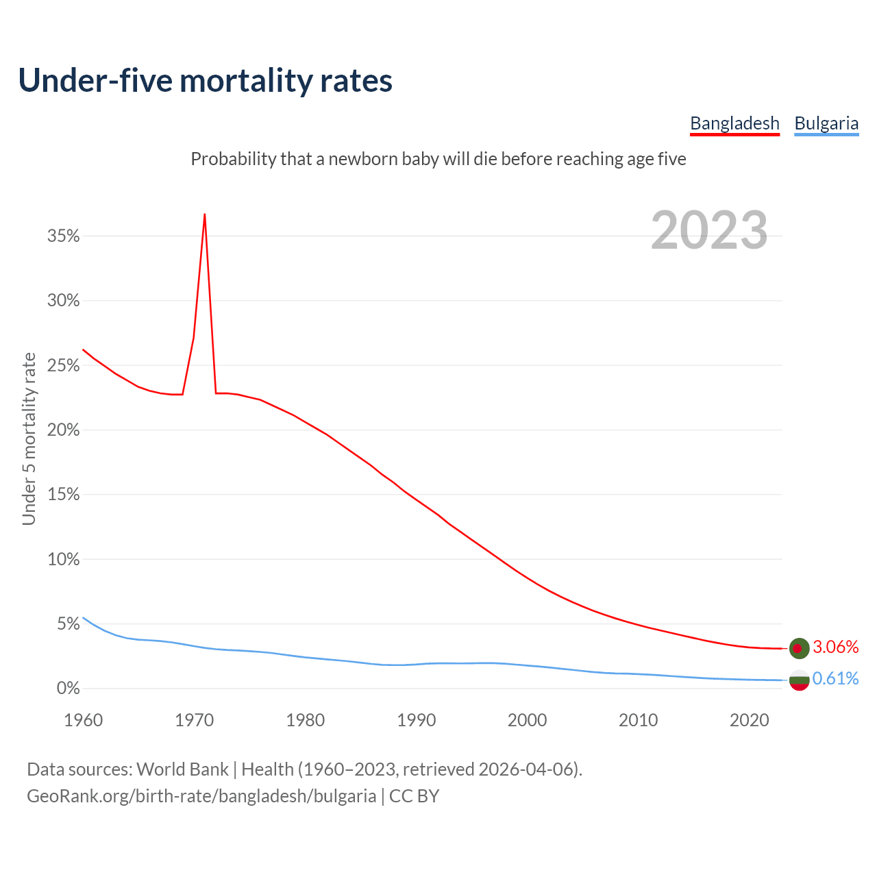 The chance that a newborn baby will die before reaching age five is 3.06% in Bangladesh and 0.61% in Bulgaria. Above is a chart with historical data on under-five mortality rates.