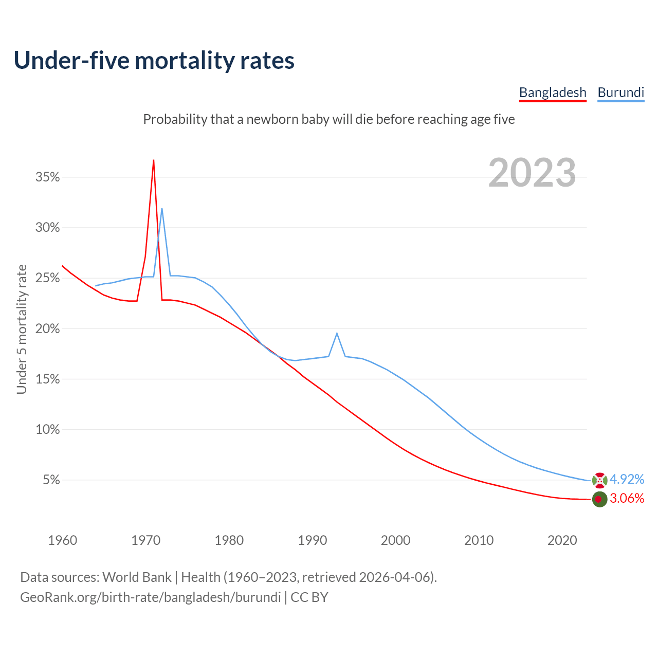 The chance that a newborn baby will die before reaching age five is 3.06% in Bangladesh and 4.92% in Burundi. Above is a chart with historical data on under-five mortality rates.