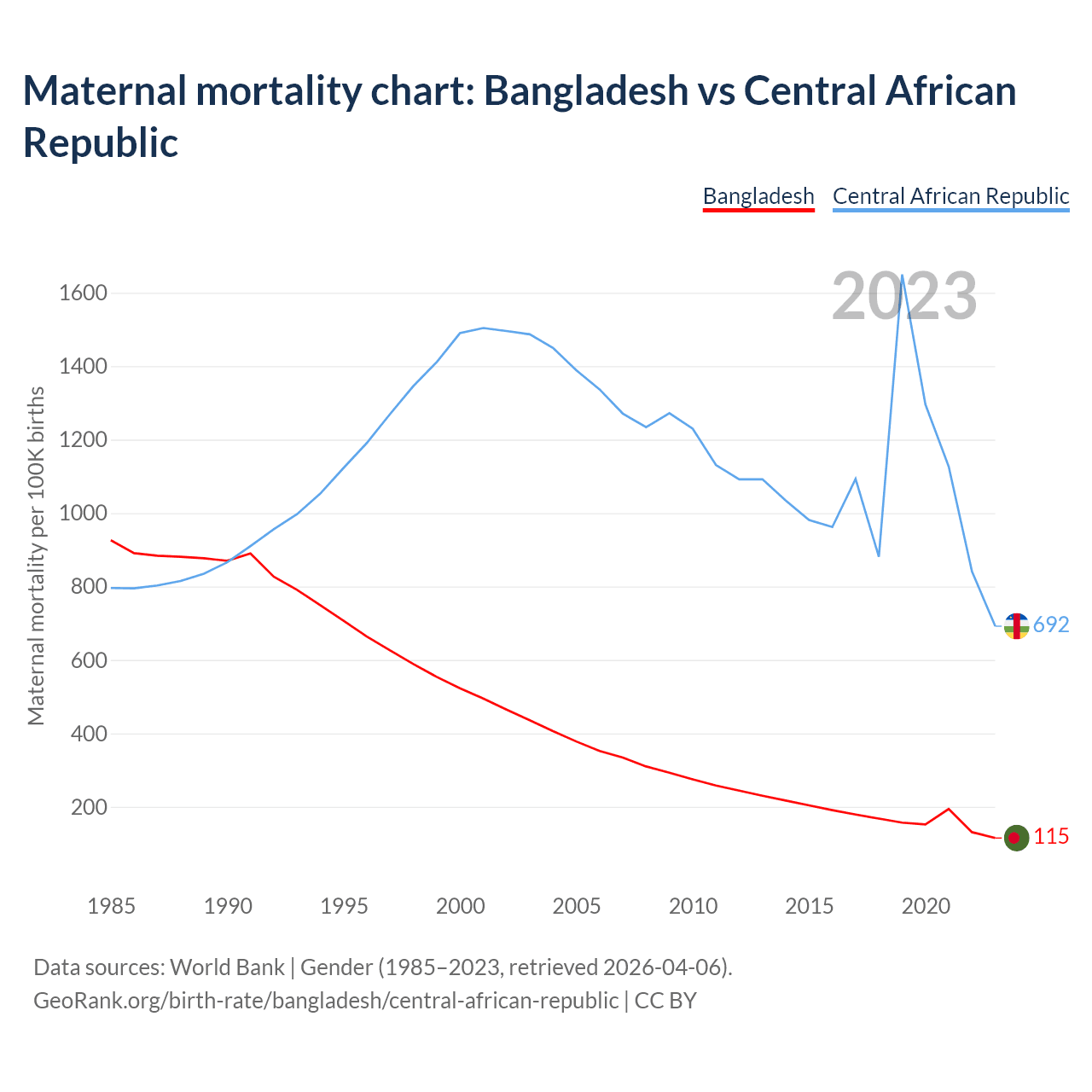 Data sources: World Bank | Gender (1985–2023, retrieved 2026-04-06).