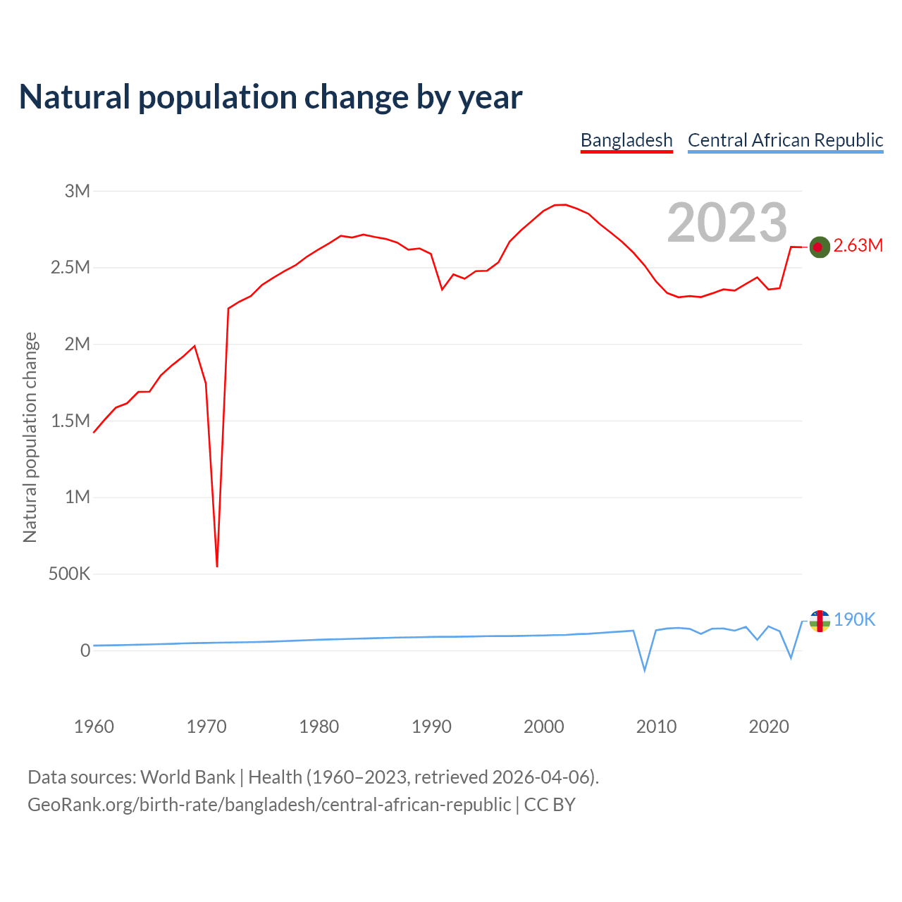 Data sources: World Bank | Health (1960–2023, retrieved 2026-04-06).