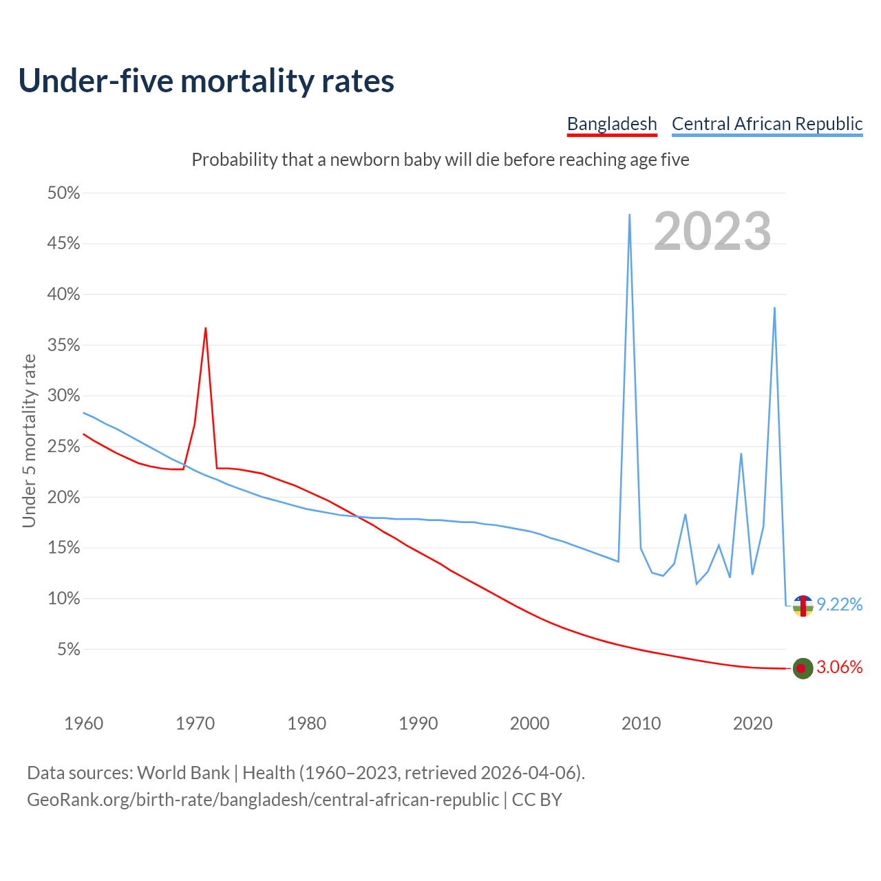The chance that a newborn baby will die before reaching age five is 3.06% in Bangladesh and 9.22% in the Central African Republic. Above is a chart with historical data on under-five mortality rates.