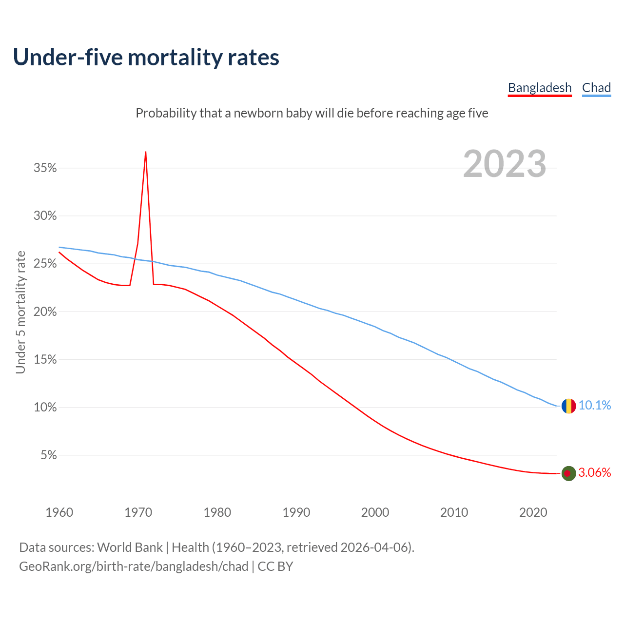 The chance that a newborn baby will die before reaching age five is 3.06% in Bangladesh and 10.1% in Chad. Above is a chart with historical data on under-five mortality rates.