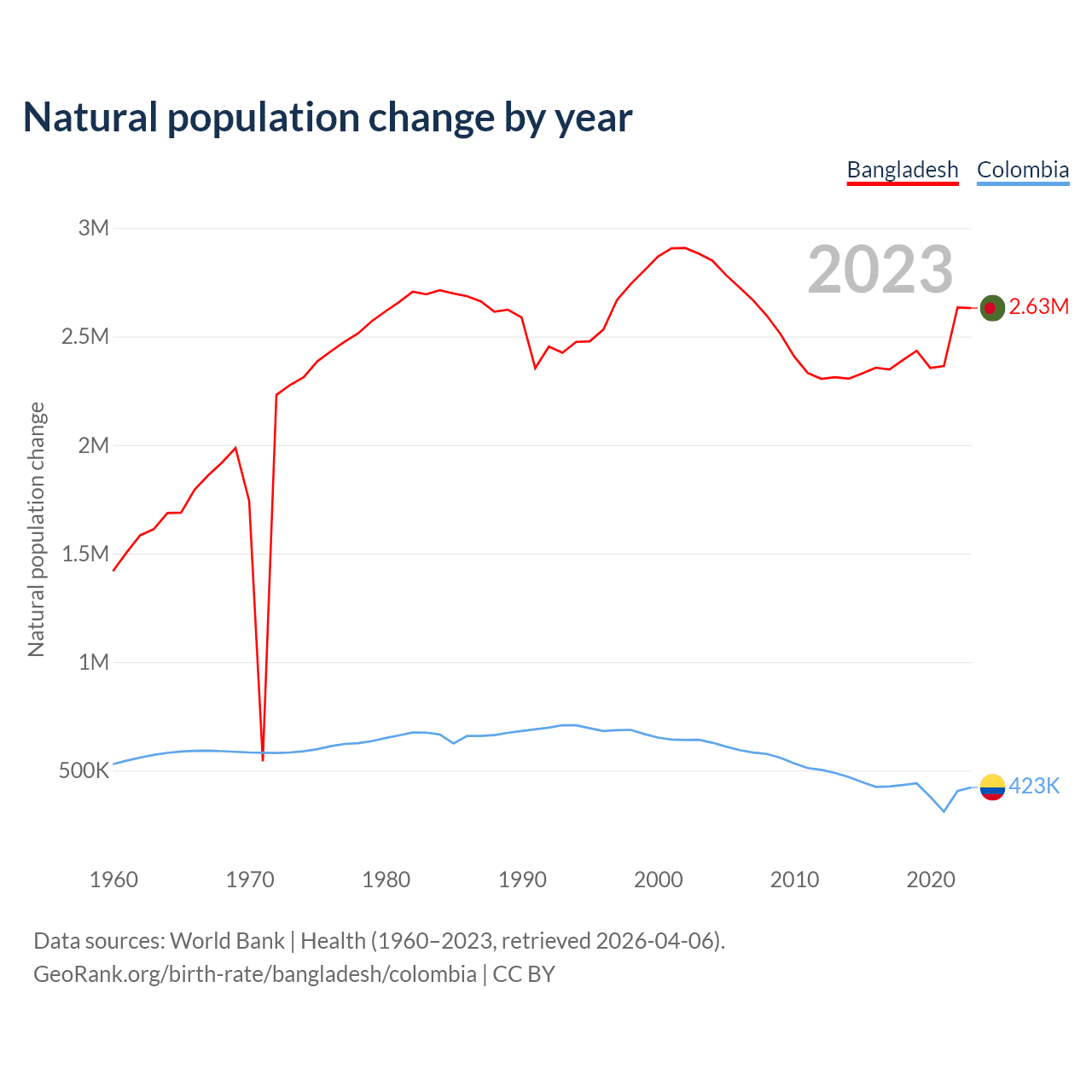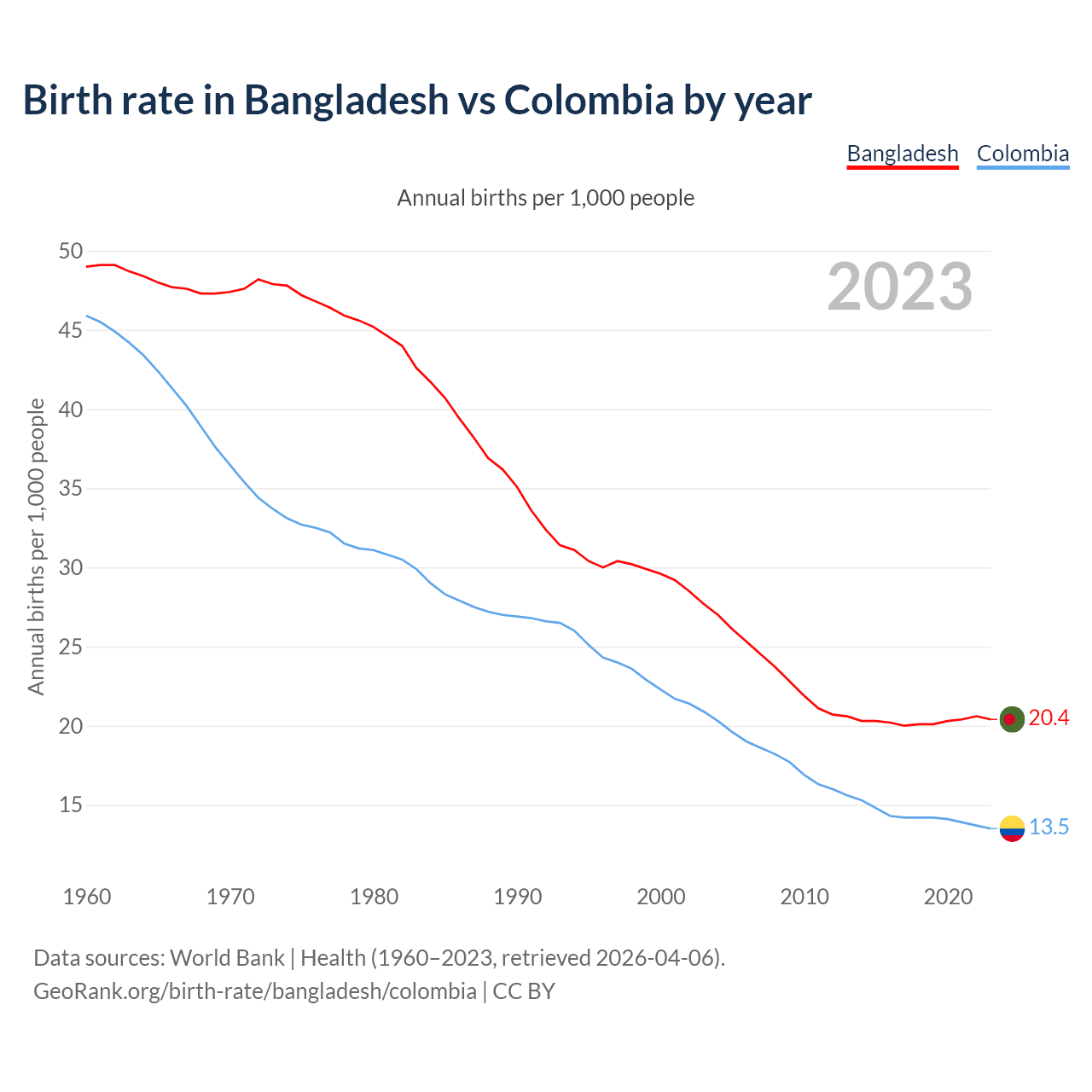 Bangladesh has an annual birth rate of 20.4 births per 1,000 people, compared to 13.5 for Colombia. The average number of children a woman is expected to have during her lifetime — the fertility rate, is 2.16 in Bangladesh and 1.65 in Colombia — 23.9% difference.