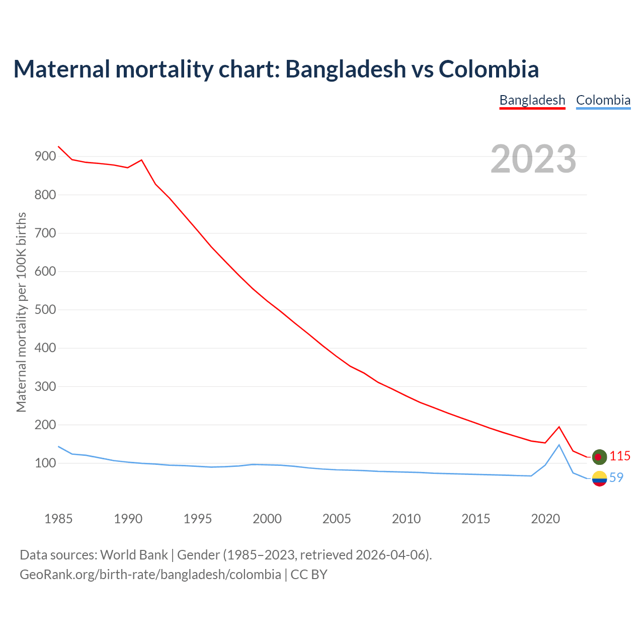 The maternal mortality rate, which is the probability of dying during childbirth or within 42 days of pregnancy termination, is 115 deaths per 100,000 live births in Bangladesh, compared to 59 deaths in Colombia.