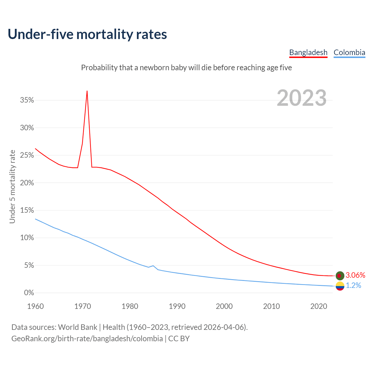 The chance that a newborn baby will die before reaching age five is 3.06% in Bangladesh and 1.2% in Colombia. Above is a chart with historical data on under-five mortality rates.