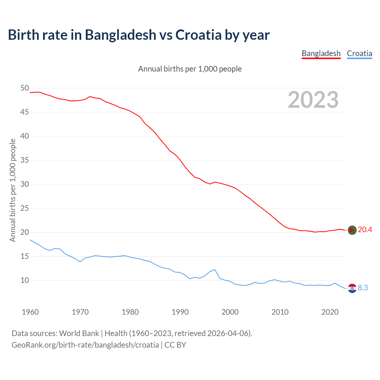 Bangladesh has an annual birth rate of 20.4 births per 1,000 people, compared to 8.3 for Croatia. The average number of children a woman is expected to have during her lifetime — the fertility rate, is 2.16 in Bangladesh and 1.46 in Croatia — 32.5% difference.