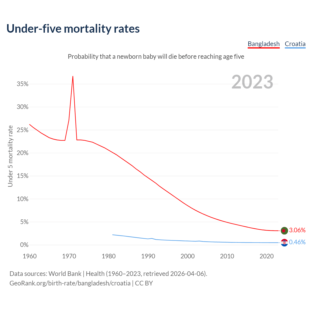 The chance that a newborn baby will die before reaching age five is 3.06% in Bangladesh and 0.46% in Croatia. Above is a chart with historical data on under-five mortality rates.
