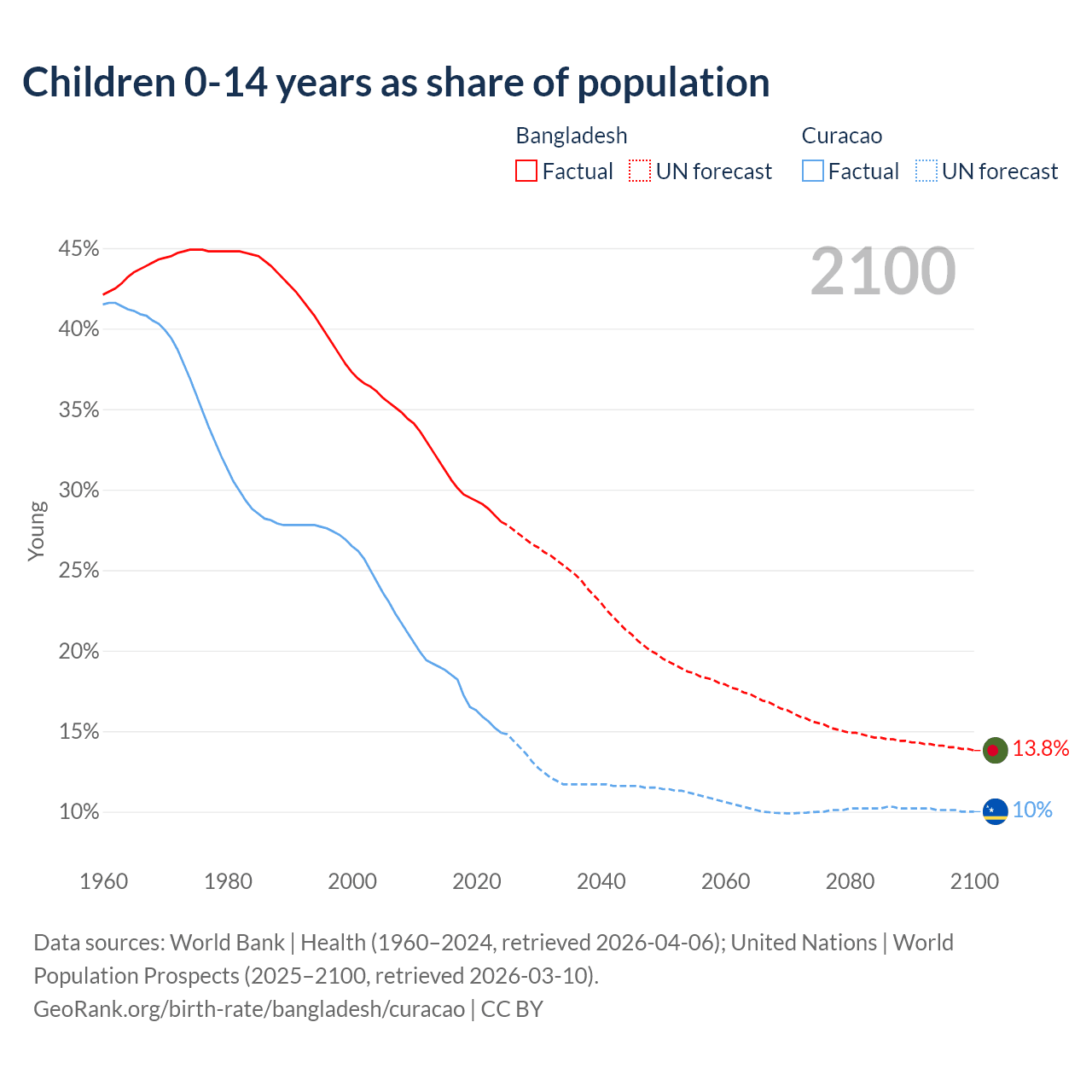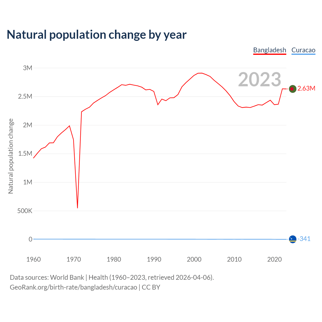 According to the latest available data on birth rates, the fertility rate in Bangladesh was 2.16 children per woman in 2023, compared to 1.2 in Curacao in 2023. The replacement level is considered to be 2.1 children per woman.