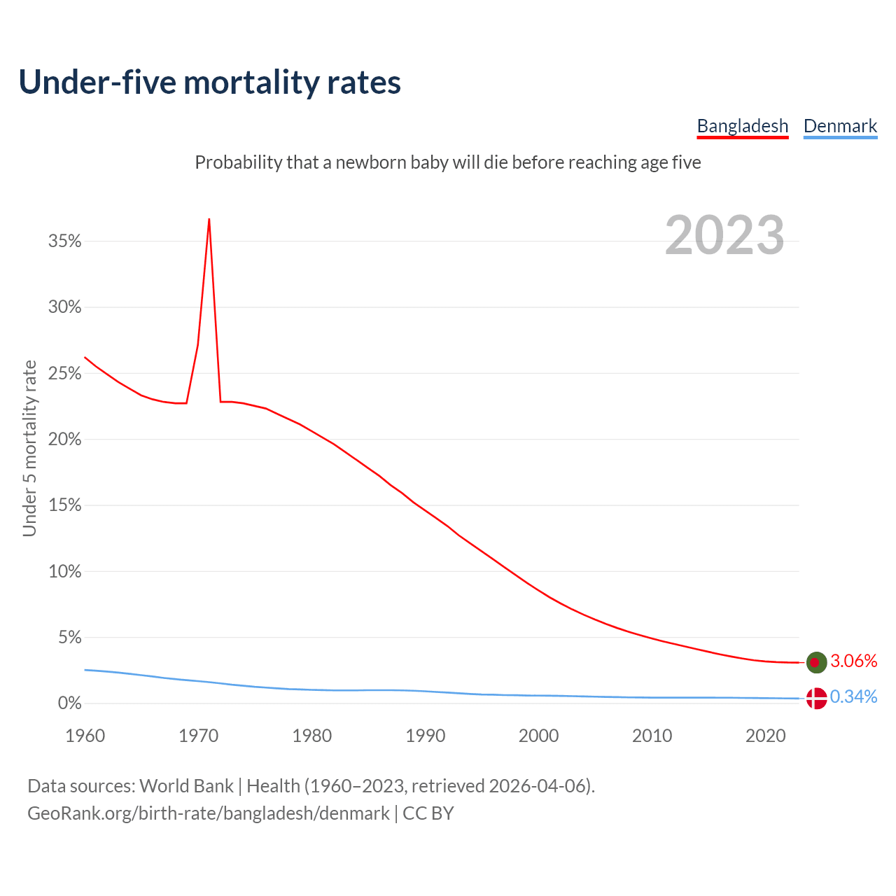 The chance that a newborn baby will die before reaching age five is 3.06% in Bangladesh and 0.34% in Denmark. Above is a chart with historical data on under-five mortality rates.