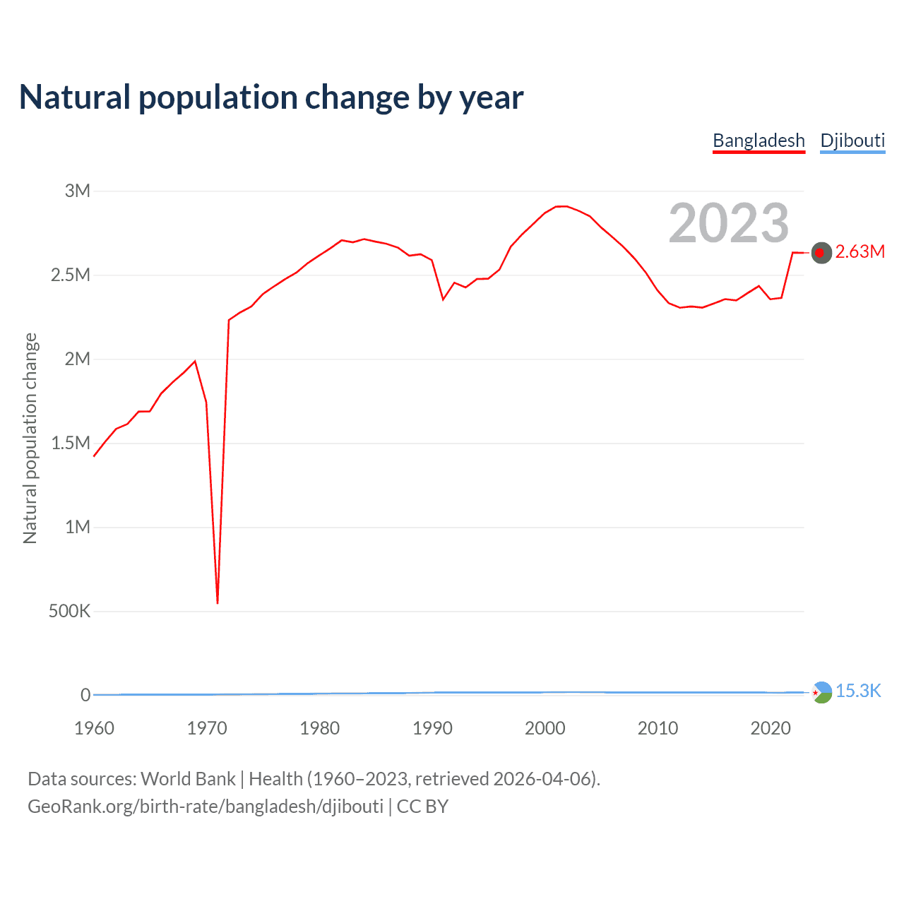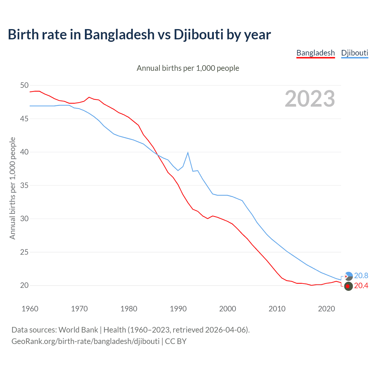 Bangladesh has an annual birth rate of 20.4 births per 1,000 people, compared to 20.8 for Djibouti. The average number of children a woman is expected to have during her lifetime — the fertility rate, is 2.16 in Bangladesh and 2.61 in Djibouti — 20.6% difference.