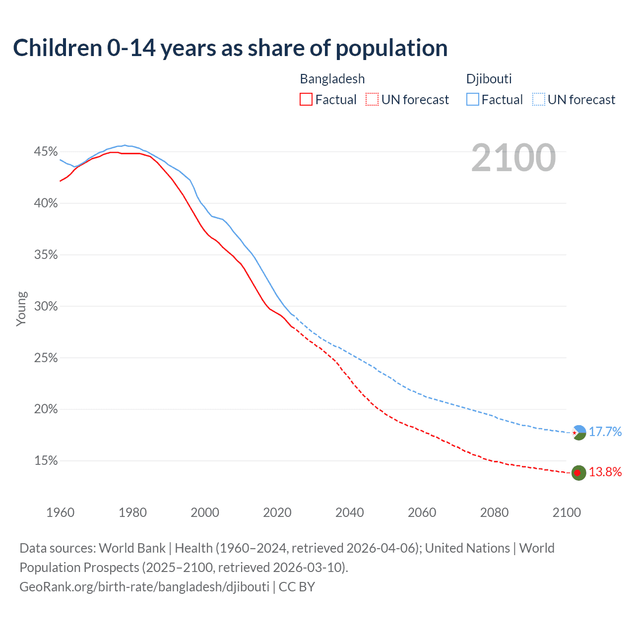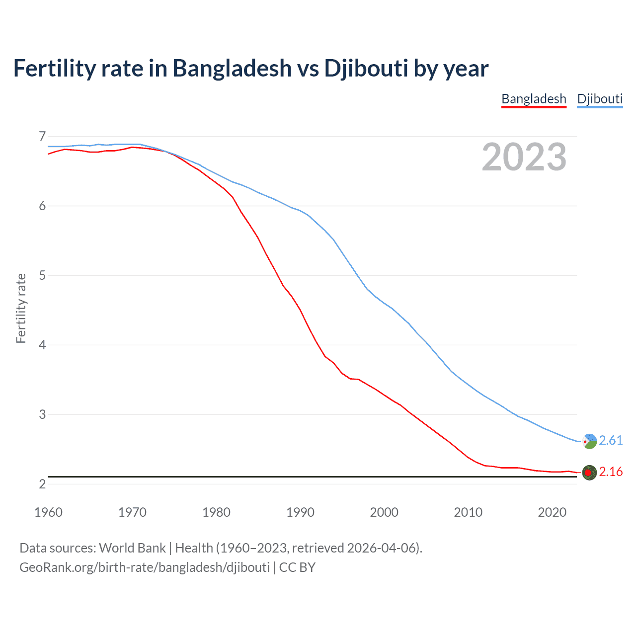 According to the latest available data on birth rates, the fertility rate in Bangladesh was 2.16 children per woman in 2023, compared to 2.61 in Djibouti in 2023. The replacement level is considered to be 2.1 children per woman.