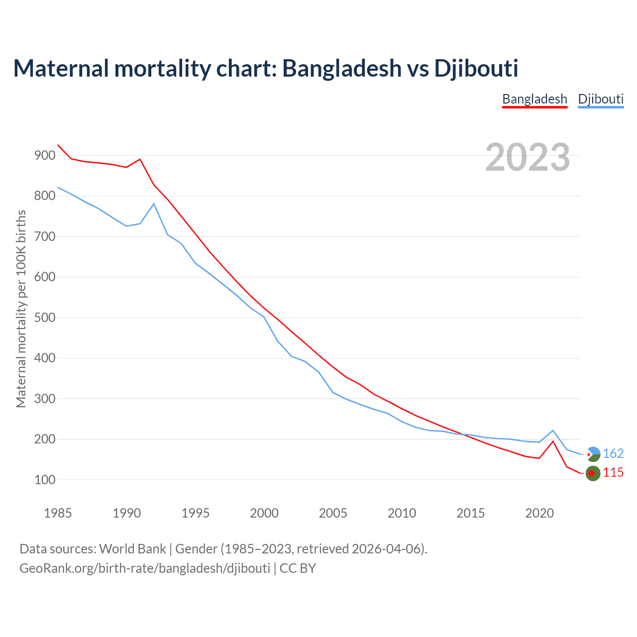 The maternal mortality rate, which is the probability of dying during childbirth or within 42 days of pregnancy termination, is 115 deaths per 100,000 live births in Bangladesh, compared to 162 deaths in Djibouti.