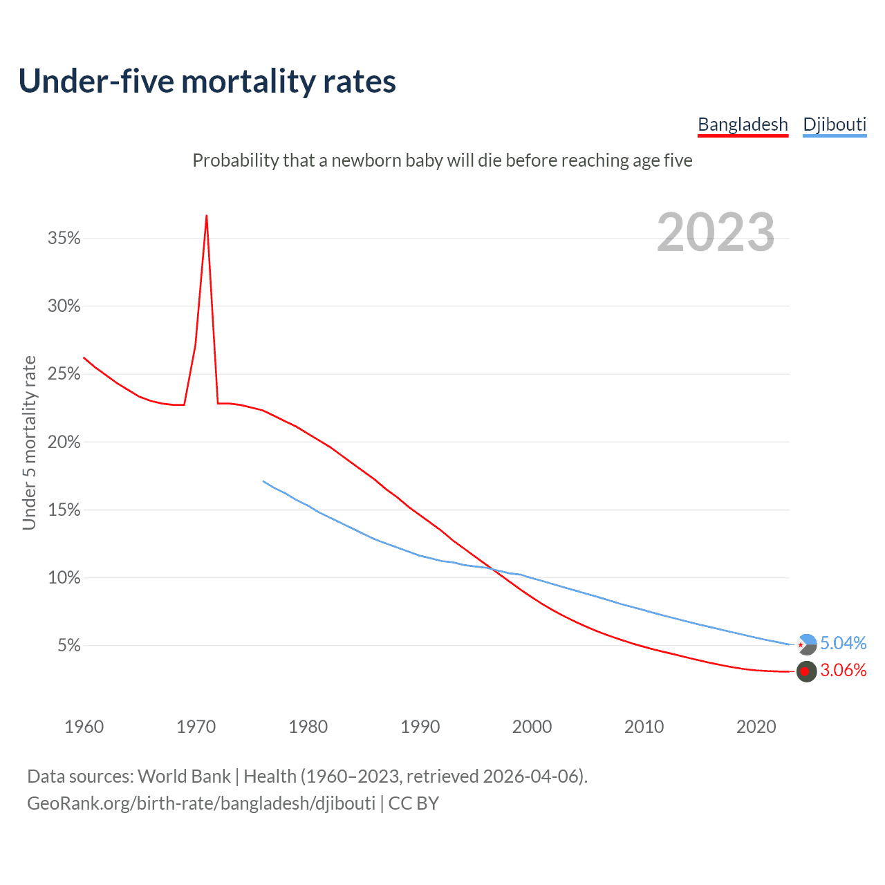 The chance that a newborn baby will die before reaching age five is 3.06% in Bangladesh and 5.04% in Djibouti. Above is a chart with historical data on under-five mortality rates.