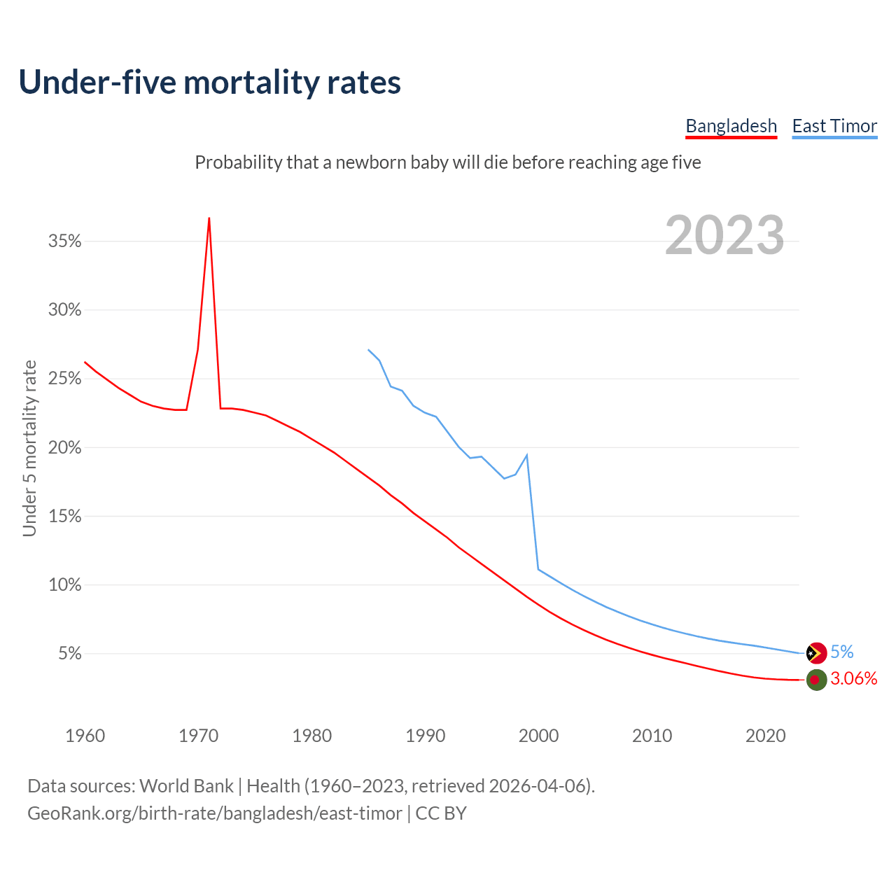 The chance that a newborn baby will die before reaching age five is 3.06% in Bangladesh and 5% in East Timor. Above is a chart with historical data on under-five mortality rates.