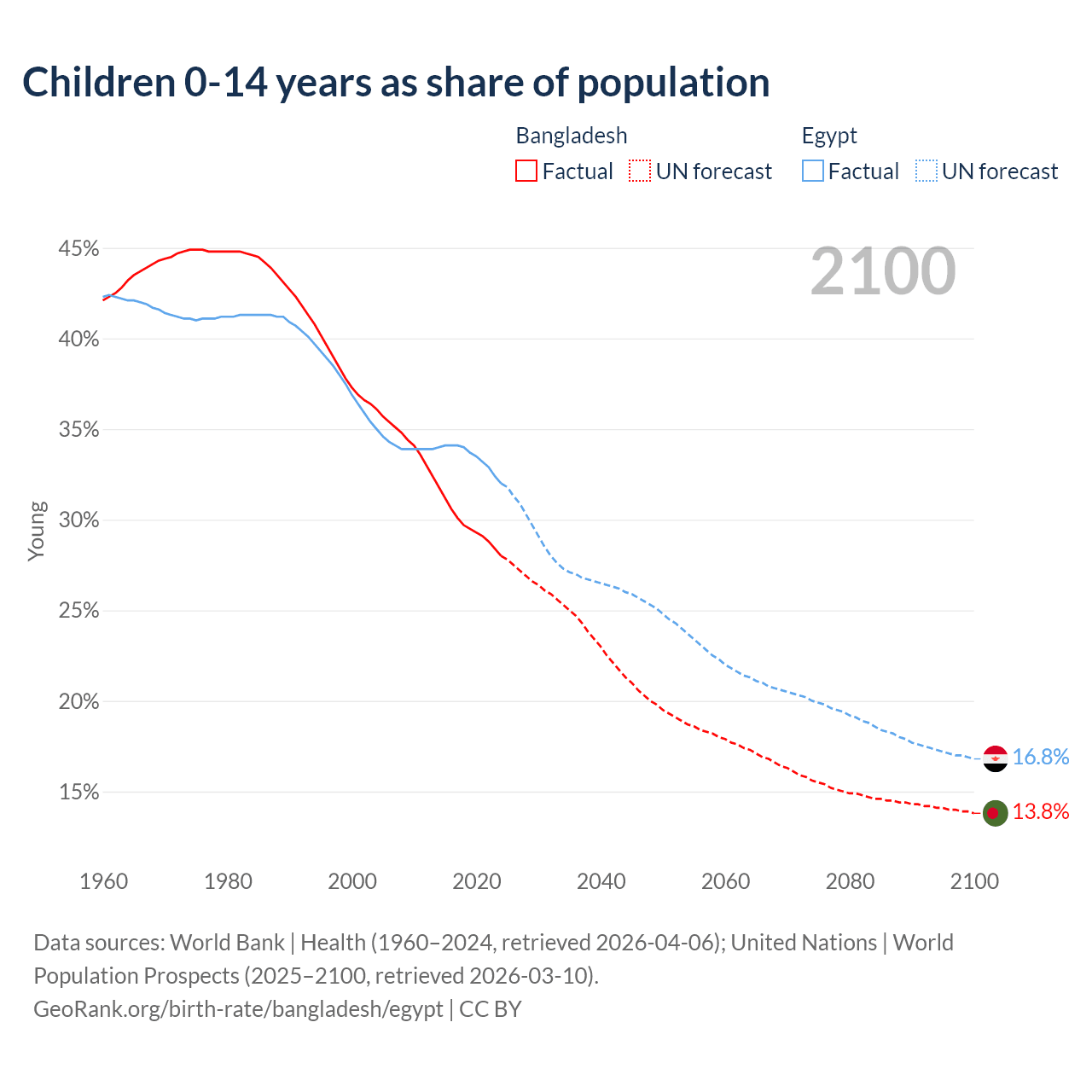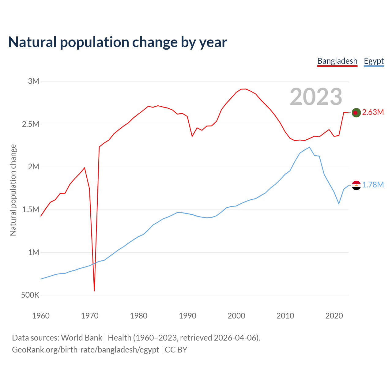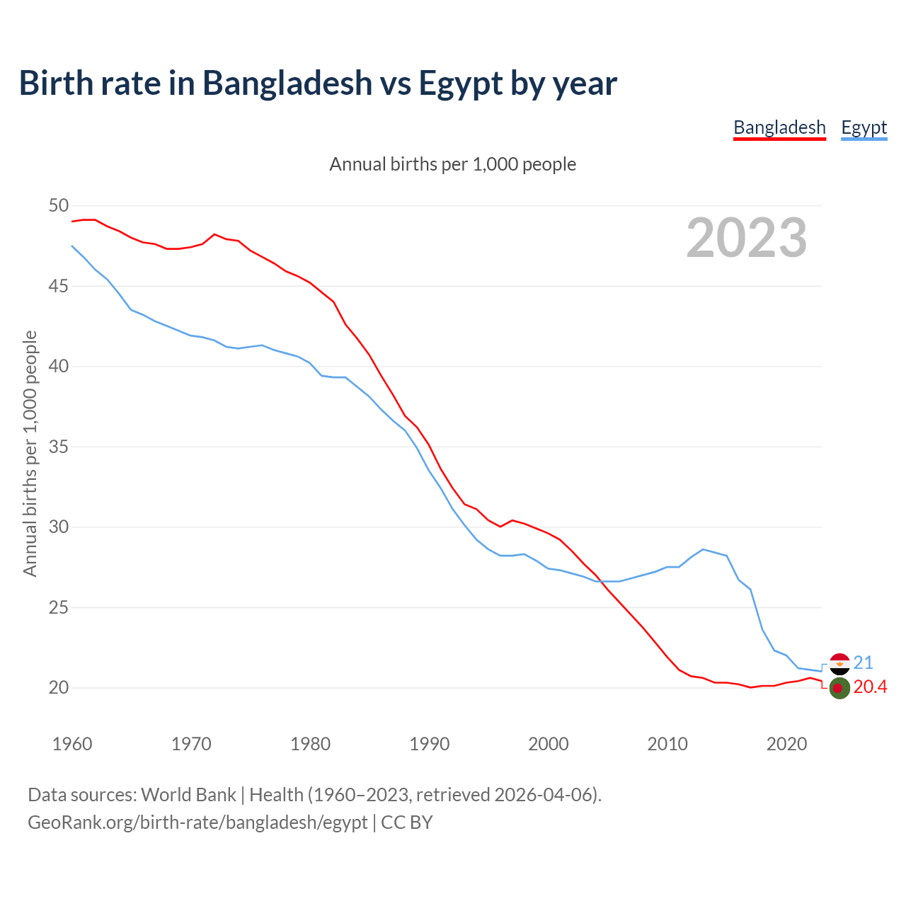 According to the latest available data on birth rates, the fertility rate in Bangladesh was 2.16 children per woman in 2023, compared to 2.75 in Egypt in 2023. The replacement level is considered to be 2.1 children per woman.