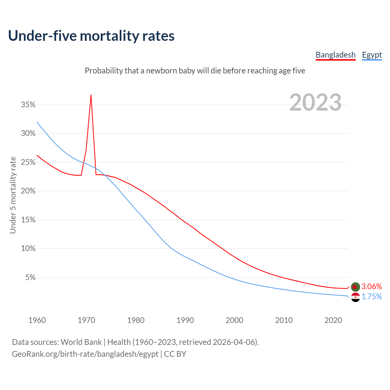 The chance that a newborn baby will die before reaching age five is 3.06% in Bangladesh and 1.75% in Egypt. Above is a chart with historical data on under-five mortality rates.
