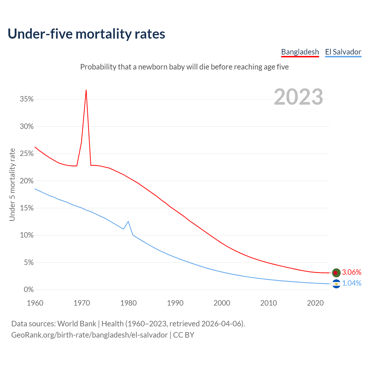 The chance that a newborn baby will die before reaching age five is 3.06% in Bangladesh and 1.04% in El Salvador. Above is a chart with historical data on under-five mortality rates.
