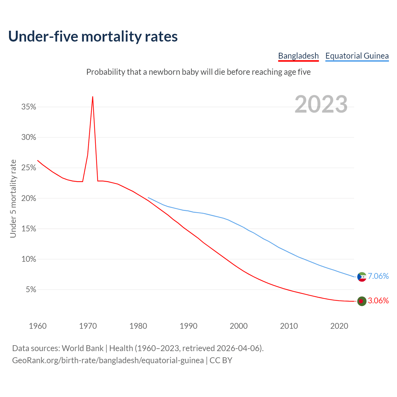 The chance that a newborn baby will die before reaching age five is 3.06% in Bangladesh and 7.06% in Equatorial Guinea. Above is a chart with historical data on under-five mortality rates.