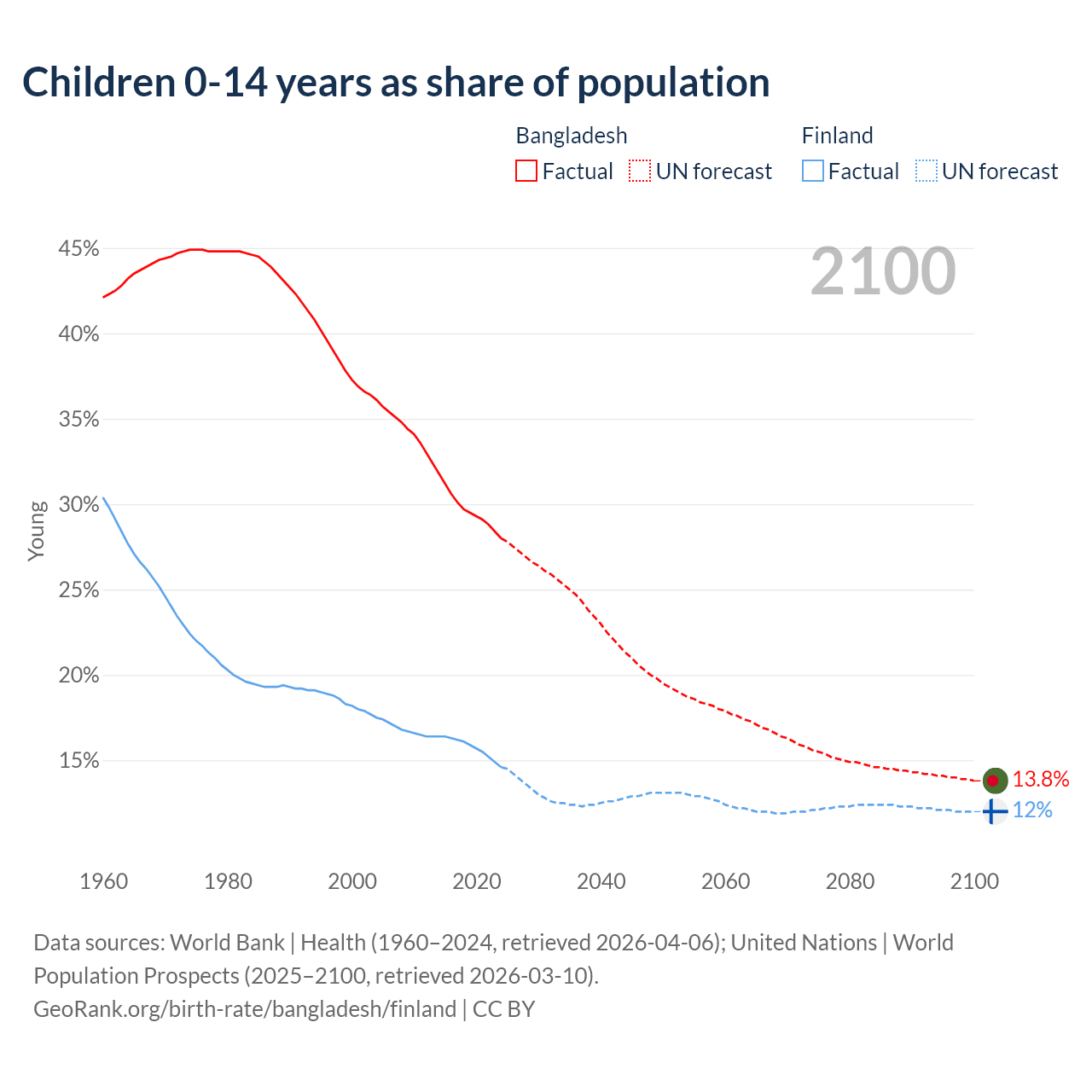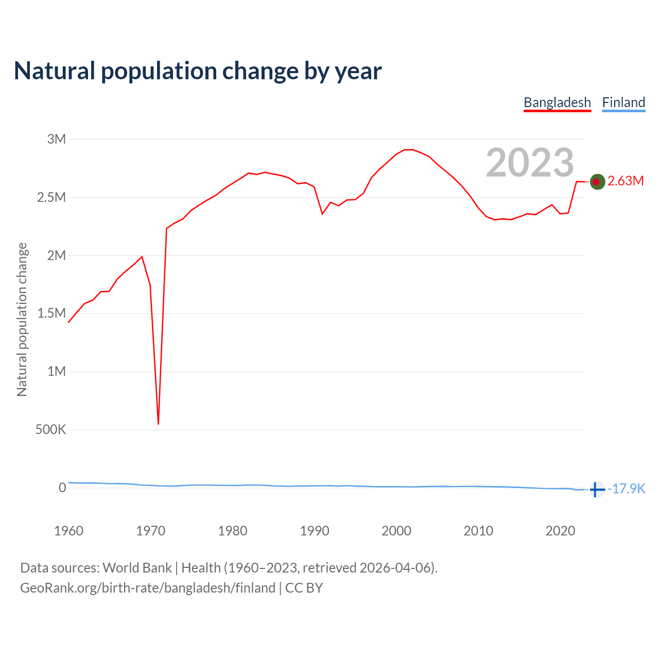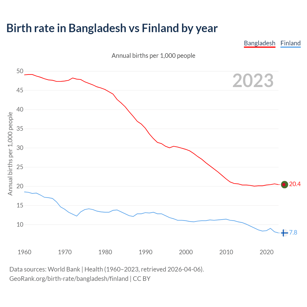 According to the latest available data on birth rates, the fertility rate in Bangladesh was 2.16 children per woman in 2023, compared to 1.26 in Finland in 2023. The replacement level is considered to be 2.1 children per woman.