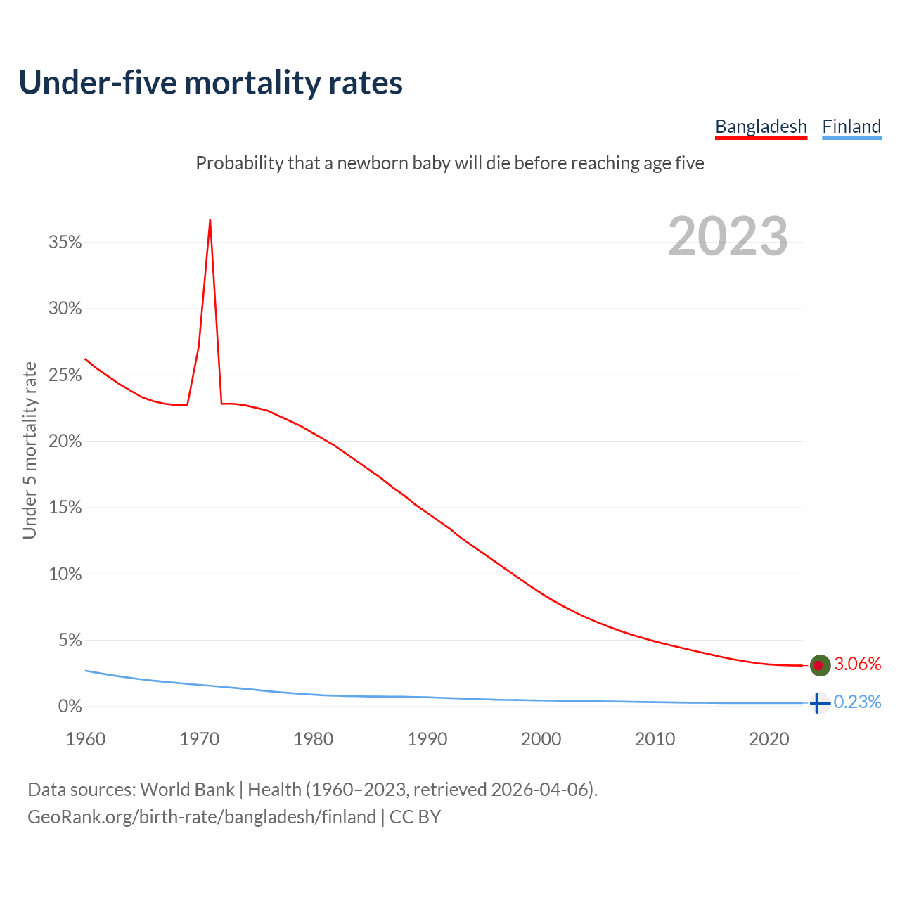 The chance that a newborn baby will die before reaching age five is 3.06% in Bangladesh and 0.23% in Finland. Above is a chart with historical data on under-five mortality rates.