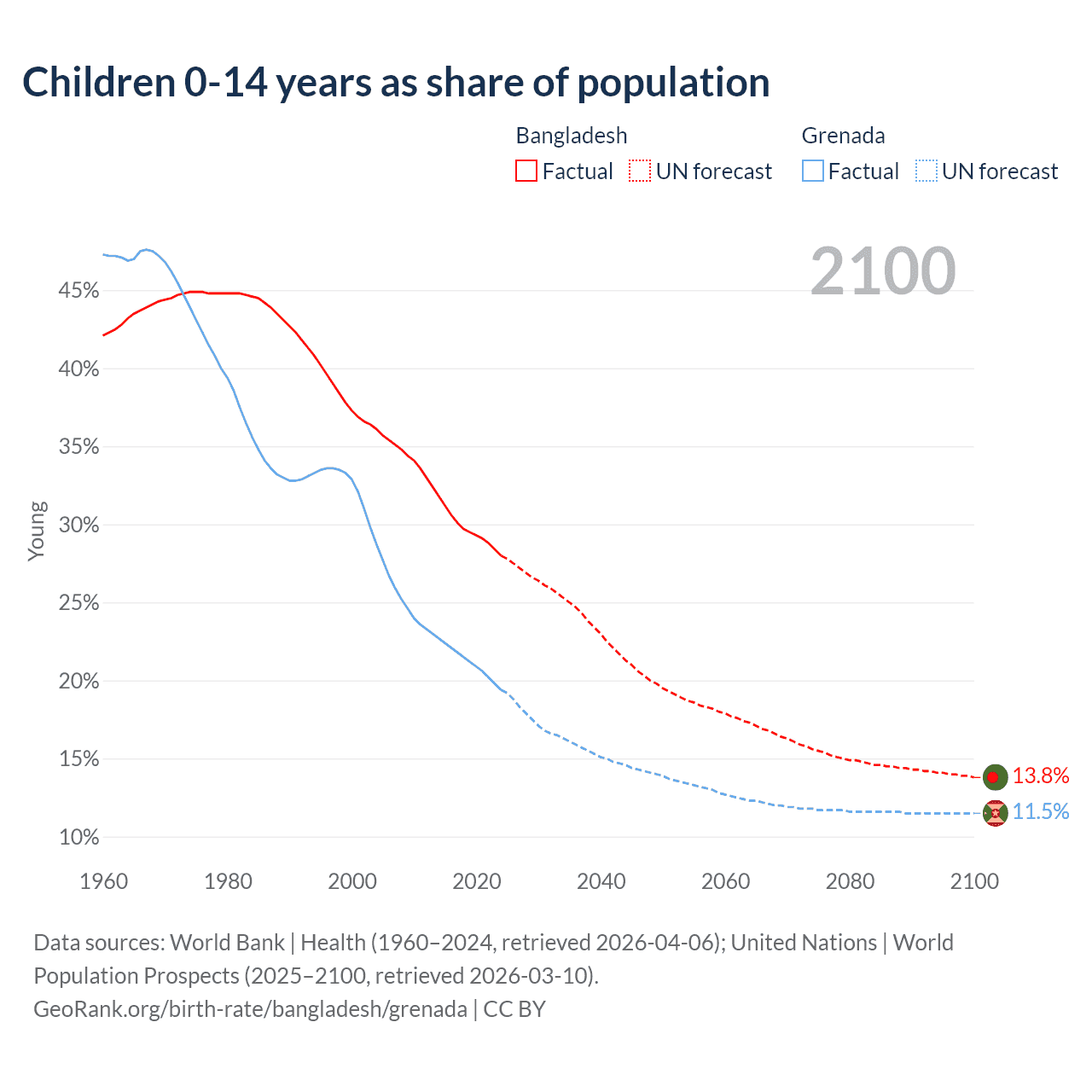 According to the latest available data on birth rates, the fertility rate in Bangladesh was 2.16 children per woman in 2023, compared to 1.49 in Grenada in 2023. The replacement level is considered to be 2.1 children per woman.