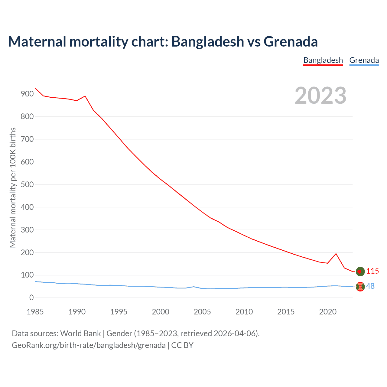 The maternal mortality rate, which is the probability of dying during childbirth or within 42 days of pregnancy termination, is 115 deaths per 100,000 live births in Bangladesh, compared to 48 deaths in Grenada.