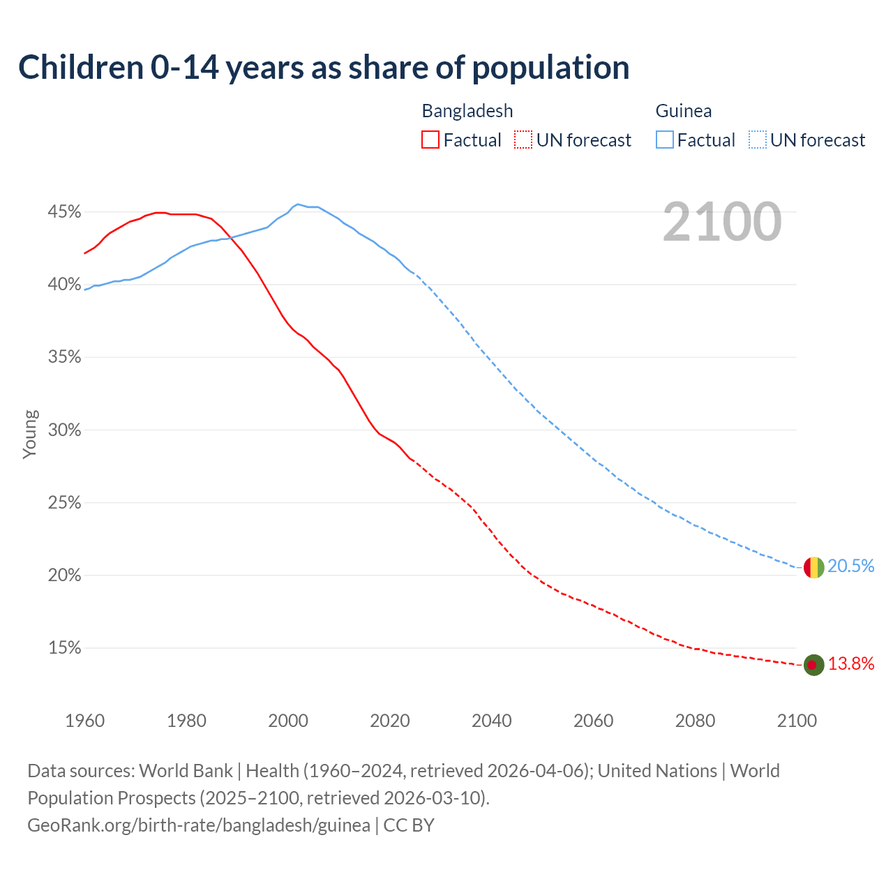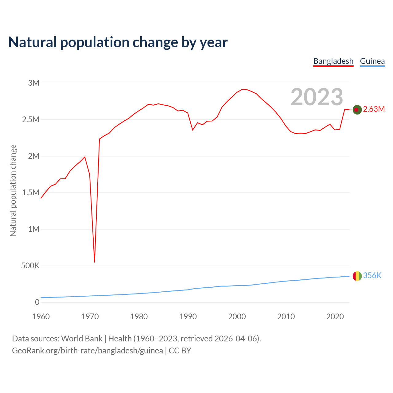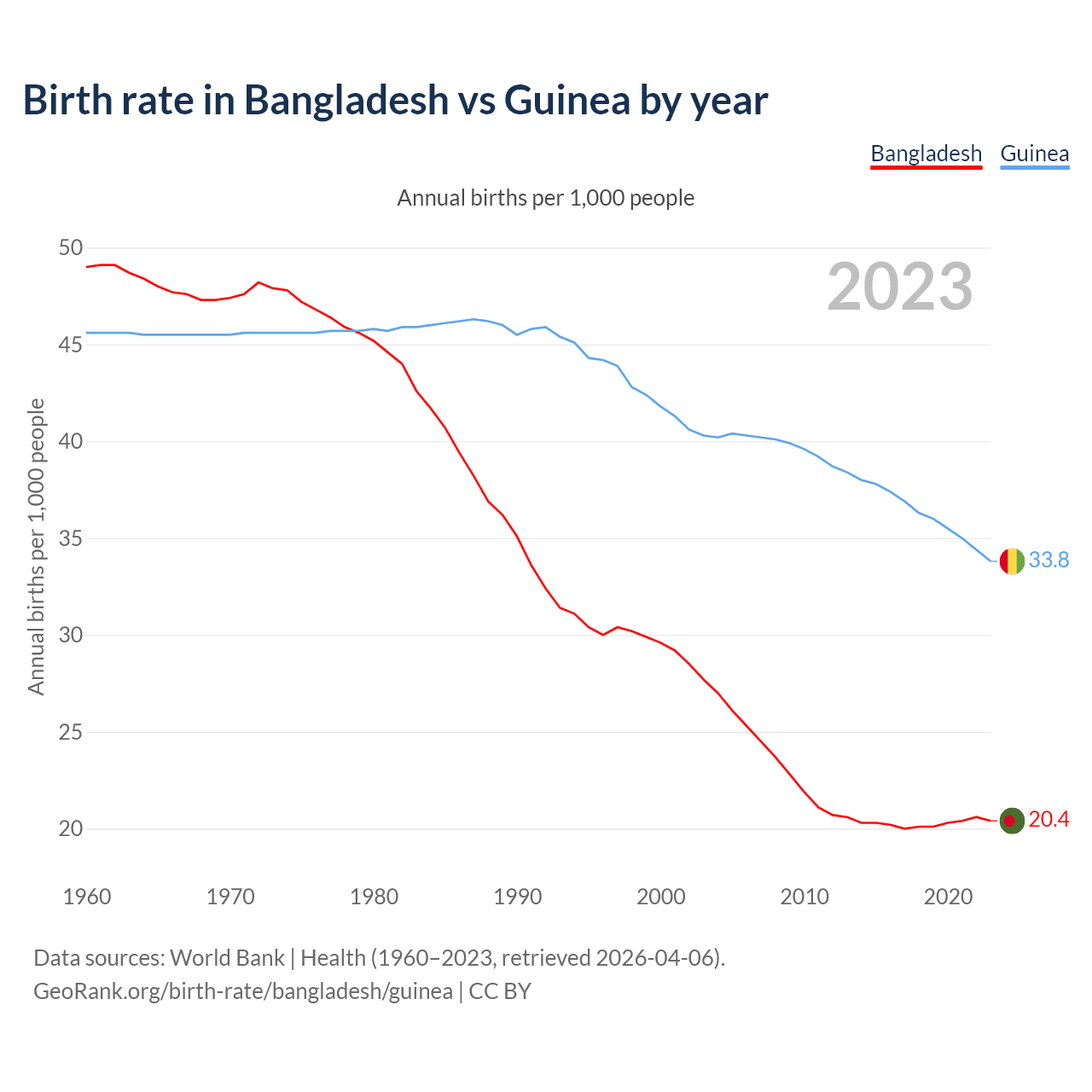 Bangladesh has an annual birth rate of 20.4 births per 1,000 people, compared to 33.8 for Guinea. The average number of children a woman is expected to have during her lifetime — the fertility rate, is 2.16 in Bangladesh and 4.22 in Guinea — 95% difference.